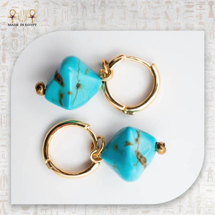 الحجر نفسه يأتي بشكل غير منتظم، مما يمنح كل زوج من الأقراط طابعًا خاصًا وكأنه قطعة مصممة يدويًا لشخص واحد فقط. اللون الأزرق الفيروزي المشبّع بعروق ذهبية رفيعة يضفي لمسة من الطاقة الهادئة والسحر الشرقي المعروف منذ القدم. الفيروز كان وما يزال حجر الحماية والصفاء، ولذلك اختياره لا يكون مجرد تفضيل جمالي بل طاقة تُرتدى.