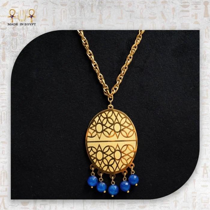 قلادة راقية بسلسلة استانلس لا تغيّر لونها، مع دلاية بيضاوية من نحاس مطلي ذهب بتصميم هندسي شرقي، تزينها أحجار العقيق الأزرق المتدلية لإطلالة فخمة ومميزة.