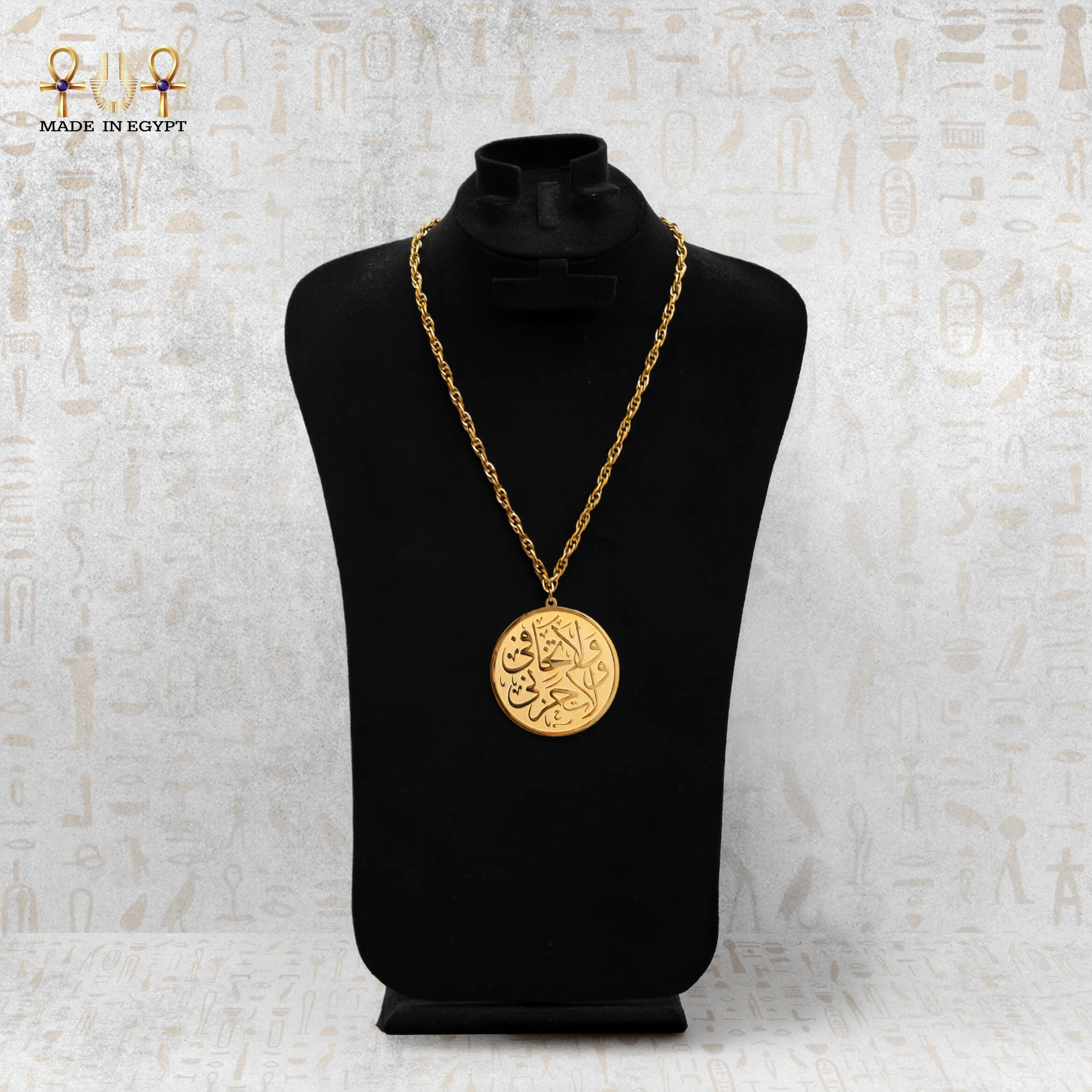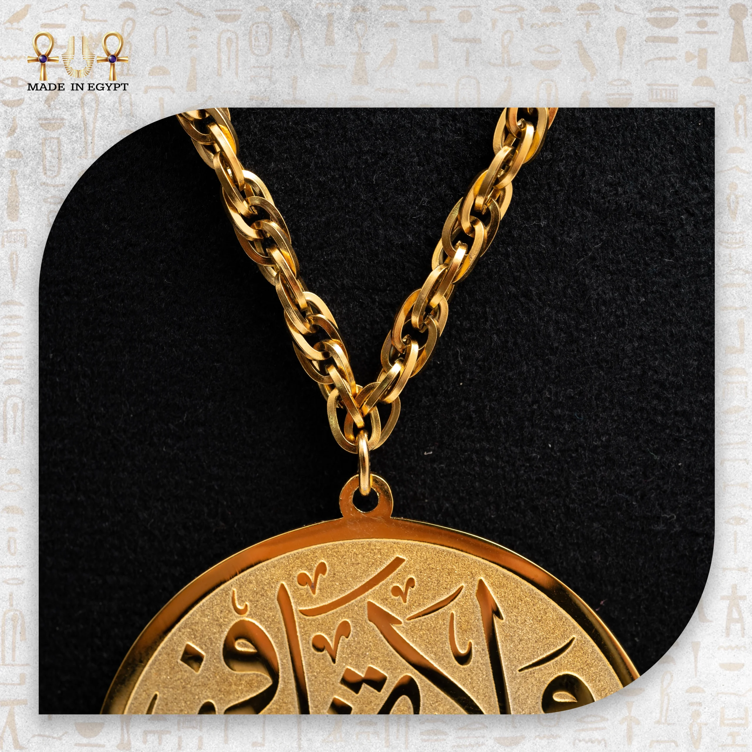 قلادة دائرية فاخرة بسلسلة استانلس لا تغيّر لونها، ودلاية نحاس مطلي ذهب منقوشة بخط عربي أنيق تمنحك إطلالة راقية وهادئة.