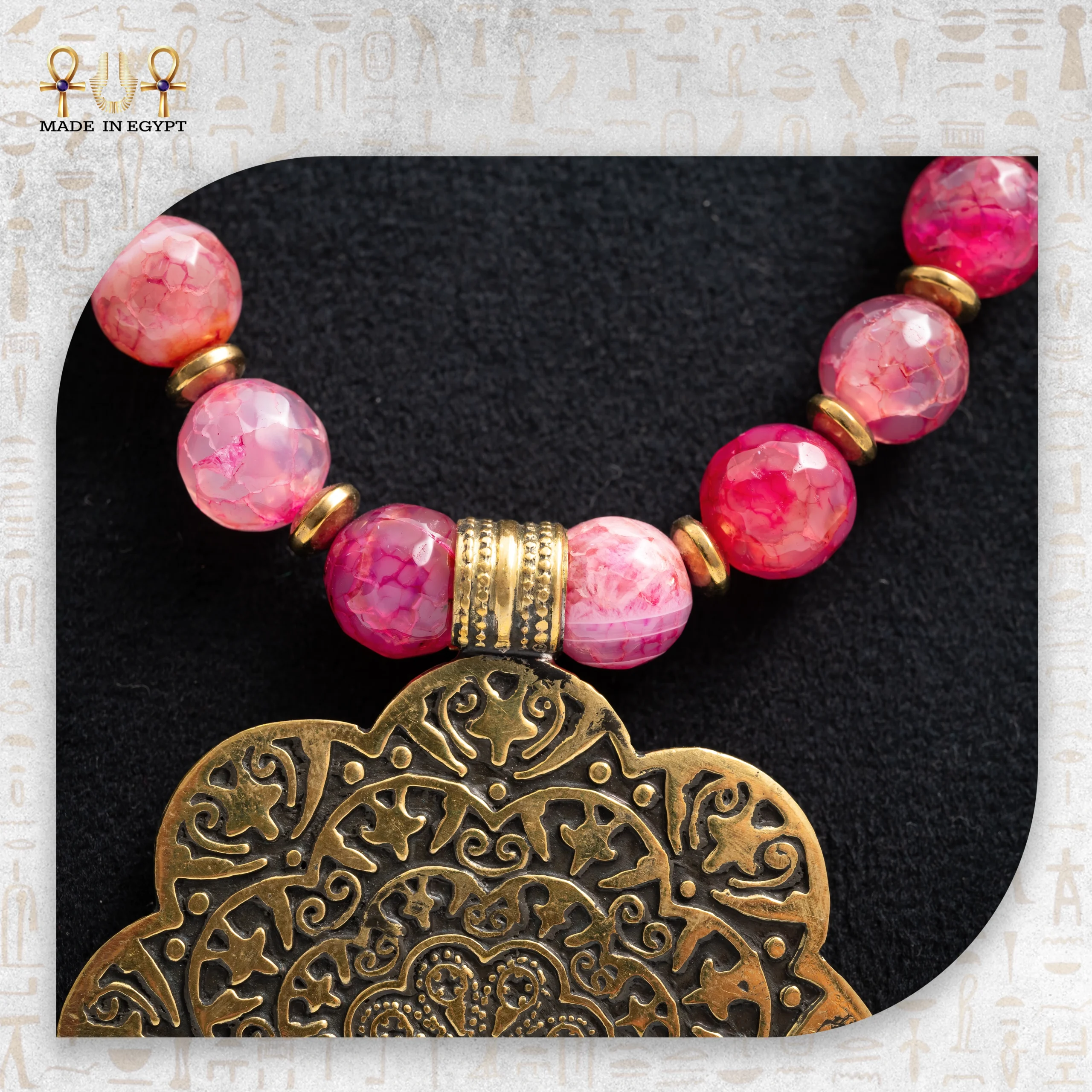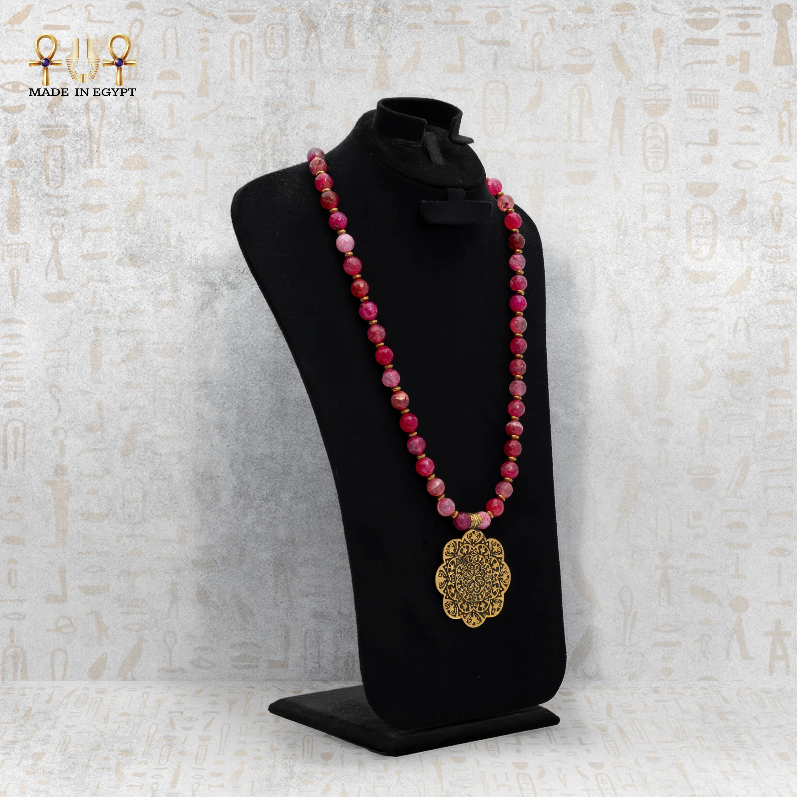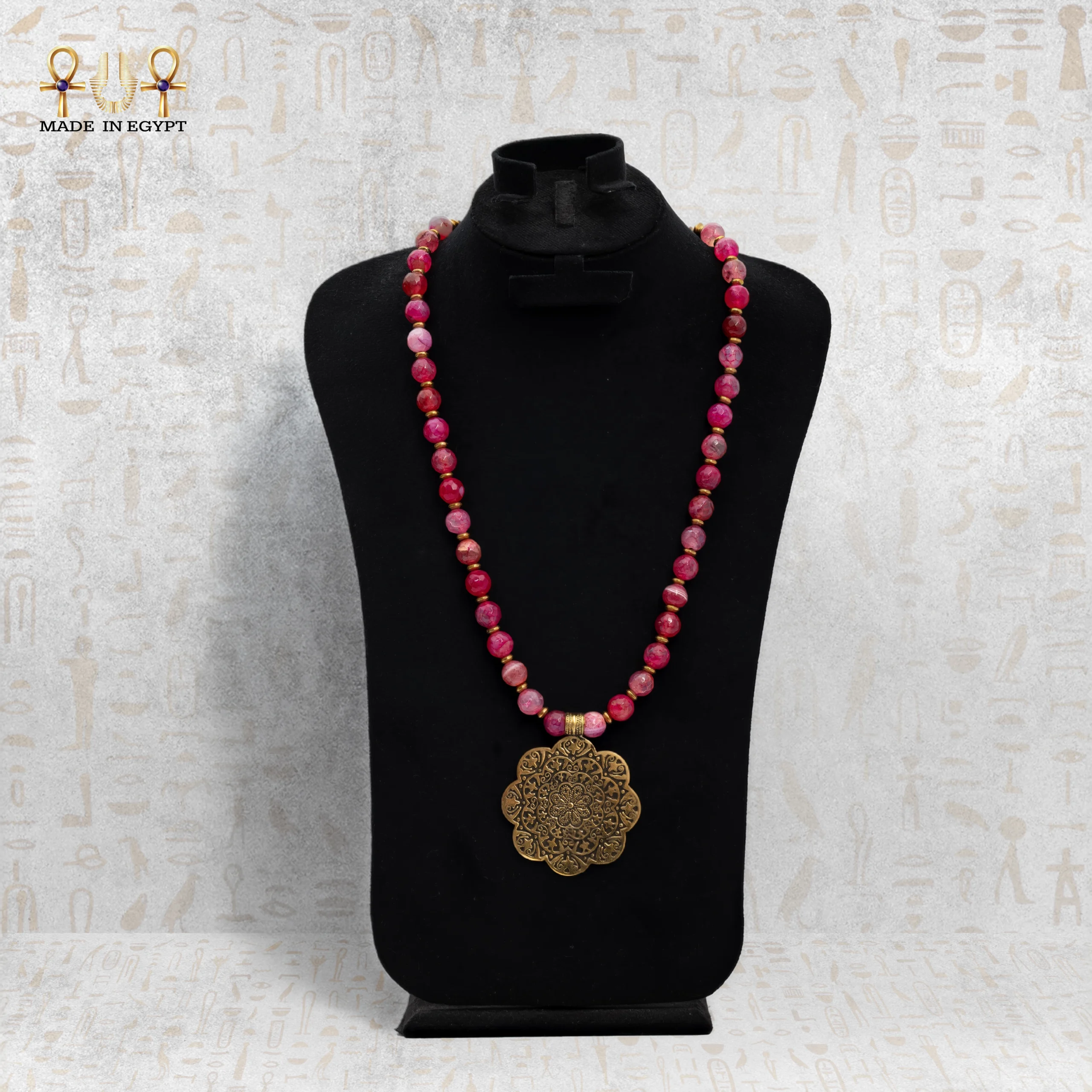 في عالم يمتلئ بالتفاصيل المتشابهة، تبقى بعض القطع قادرة على لفت الأنظار منذ اللحظة الأولى… تمامًا مثل هذه القلادة الفريدة المصنوعة بروح الفن الشرقي ولمسة من الأصالة التي لا تُشبه غيرها. تبدأ حكاية هذه القطعة من اختيار خاماتها بعناية؛ حبات العقيق الطبيعي بلونها الوردي والفوشيا المتدرّج، كل حبة منها تحمل داخليًا خطوطًا وأشكالًا صنعتها الطبيعة عبر السنين، مما يجعلها ليست مجرد حجر… بل قطعة حياة صغيرة تحمل طاقة وجمالًا لا يمكن تكراره.