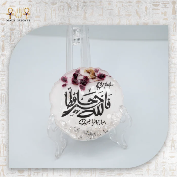 A handcrafted resin décor piece adorned with dried flowers and elegant Arabic calligraphy, bringing a spiritual and artistic touch to any space. Perfect for gifting or home styling.