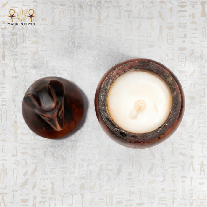 The lid features the sculpted head of a protective deity—one of the guardians who guided royalty into the afterlife. Because of this symbolic design, the candle becomes far more than décor. Instead, it serves as a meaningful object representing protection, spirituality, and cultural elegance.