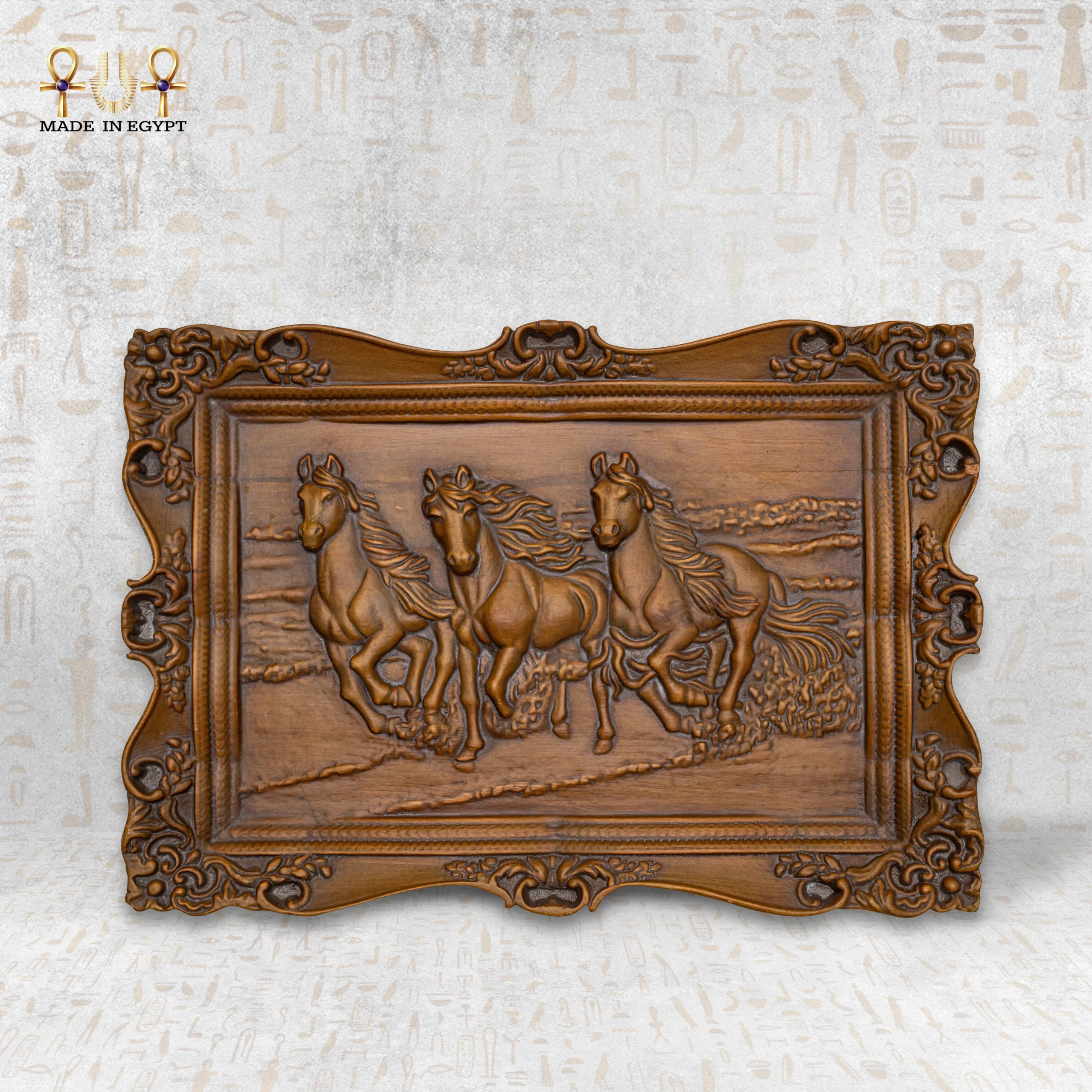 A hand-carved acacia wood panel featuring detailed Arabian horses. A vintage artistic piece that adds elegance and a timeless character to any space.