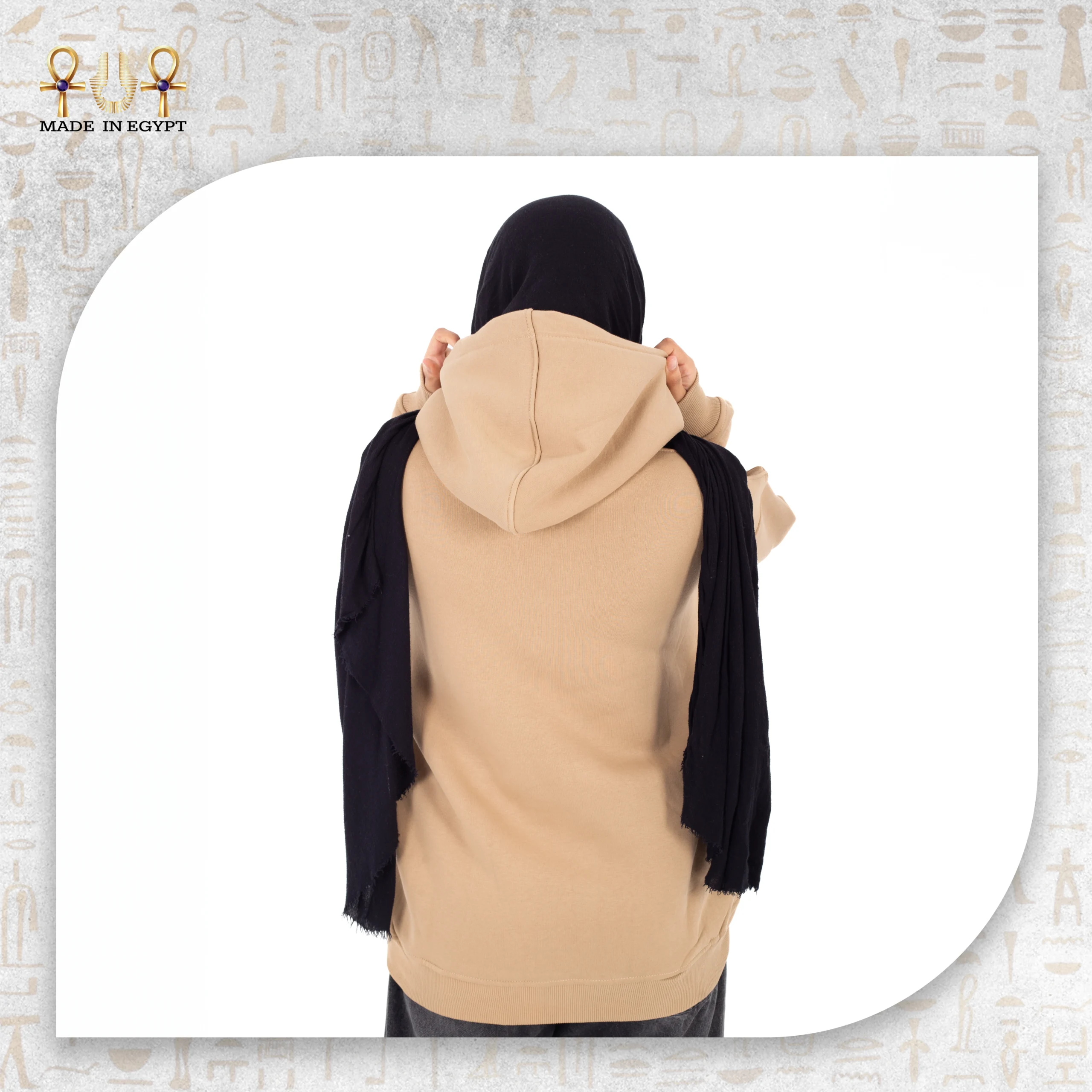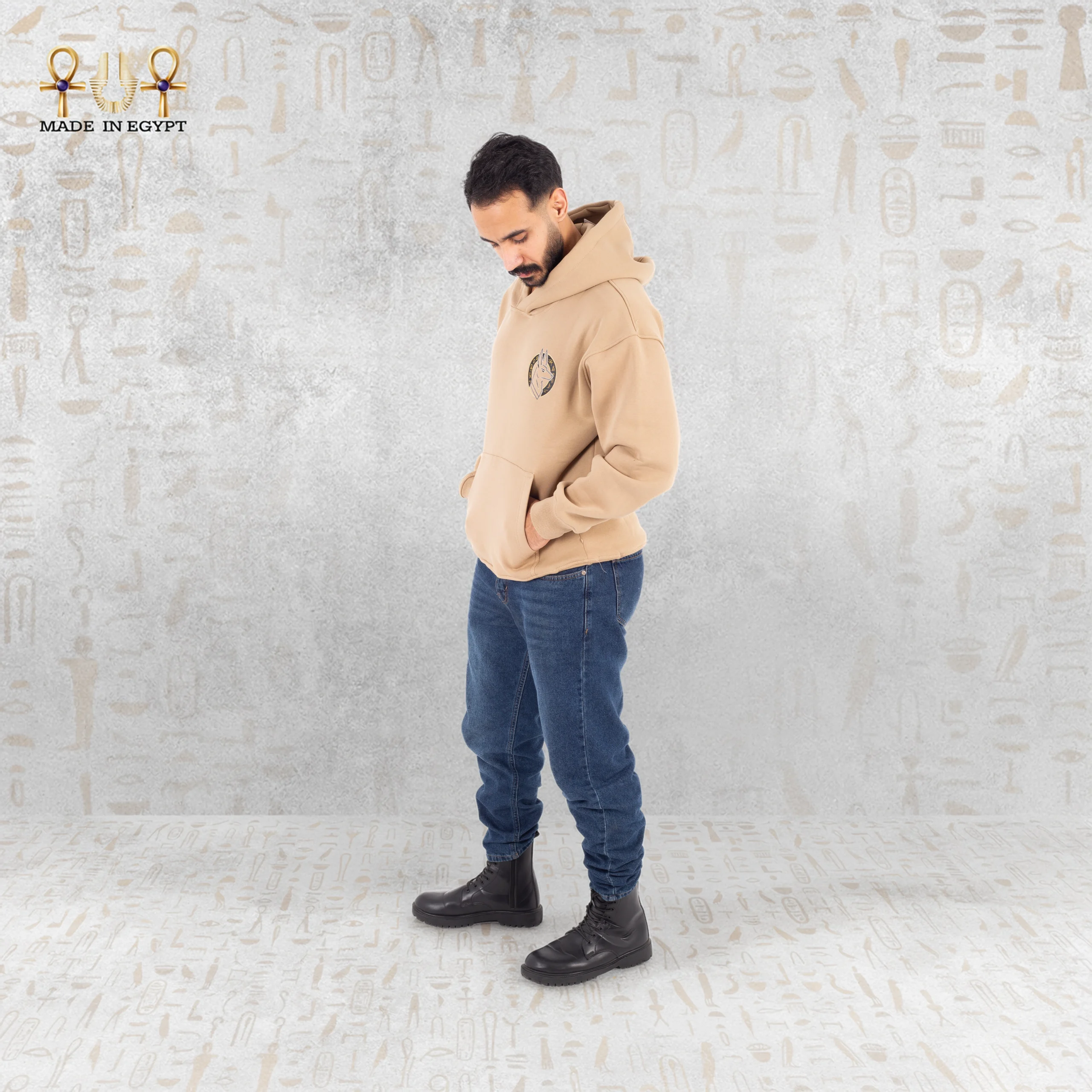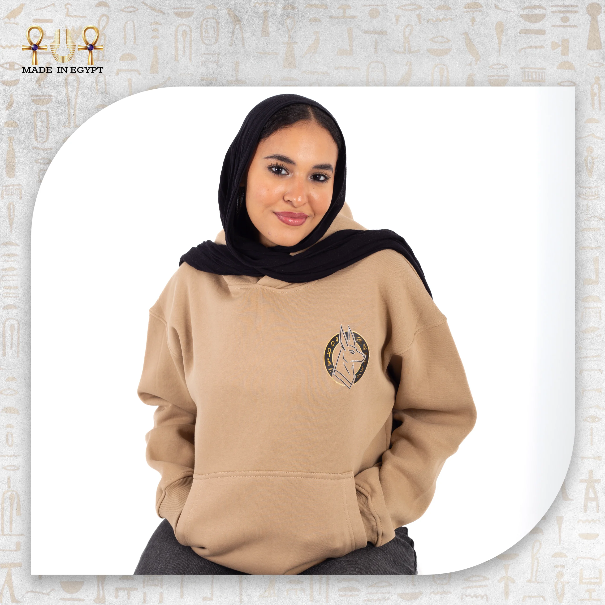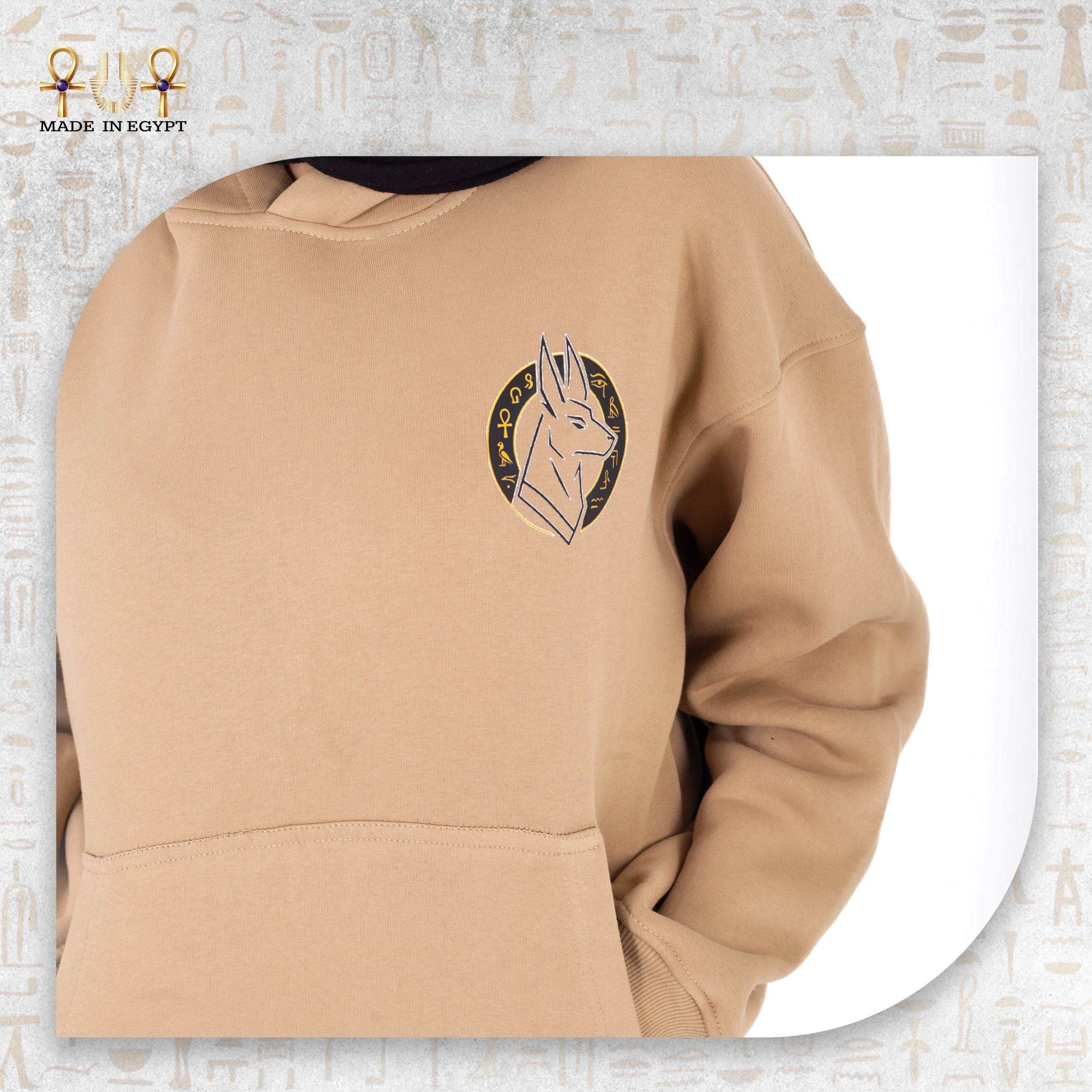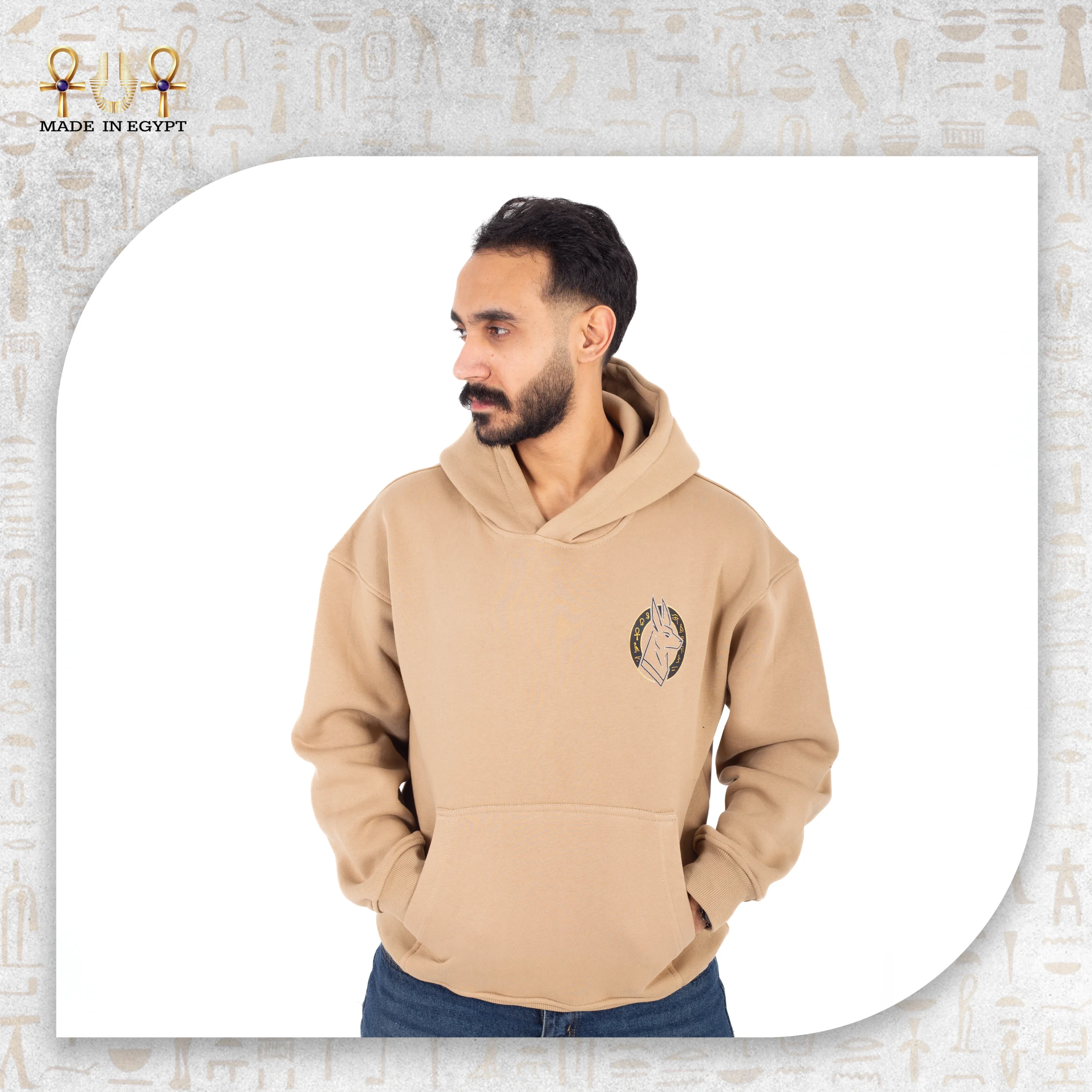 Proudly Made in Egypt, the Anubis Protector Hoodie celebrates local artisanship while honoring one of the most iconic Egyptian deities. Available in classic black for a strong, bold aesthetic or beige for a soft, refined look, the hoodie adapts to multiple styles and personal expressions.