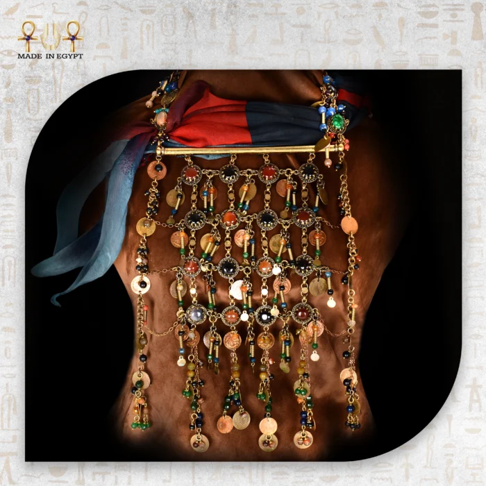 Pure red copper coins enrich the design. Their engraved patterns echo historical Arab motifs commonly found in old bazaars and traditional jewelry. The warm copper tone adds texture and depth, and it brings a nostalgic link to ancient markets. Together, the brass, copper, and gemstones create a piece that feels both historic and contemporary.