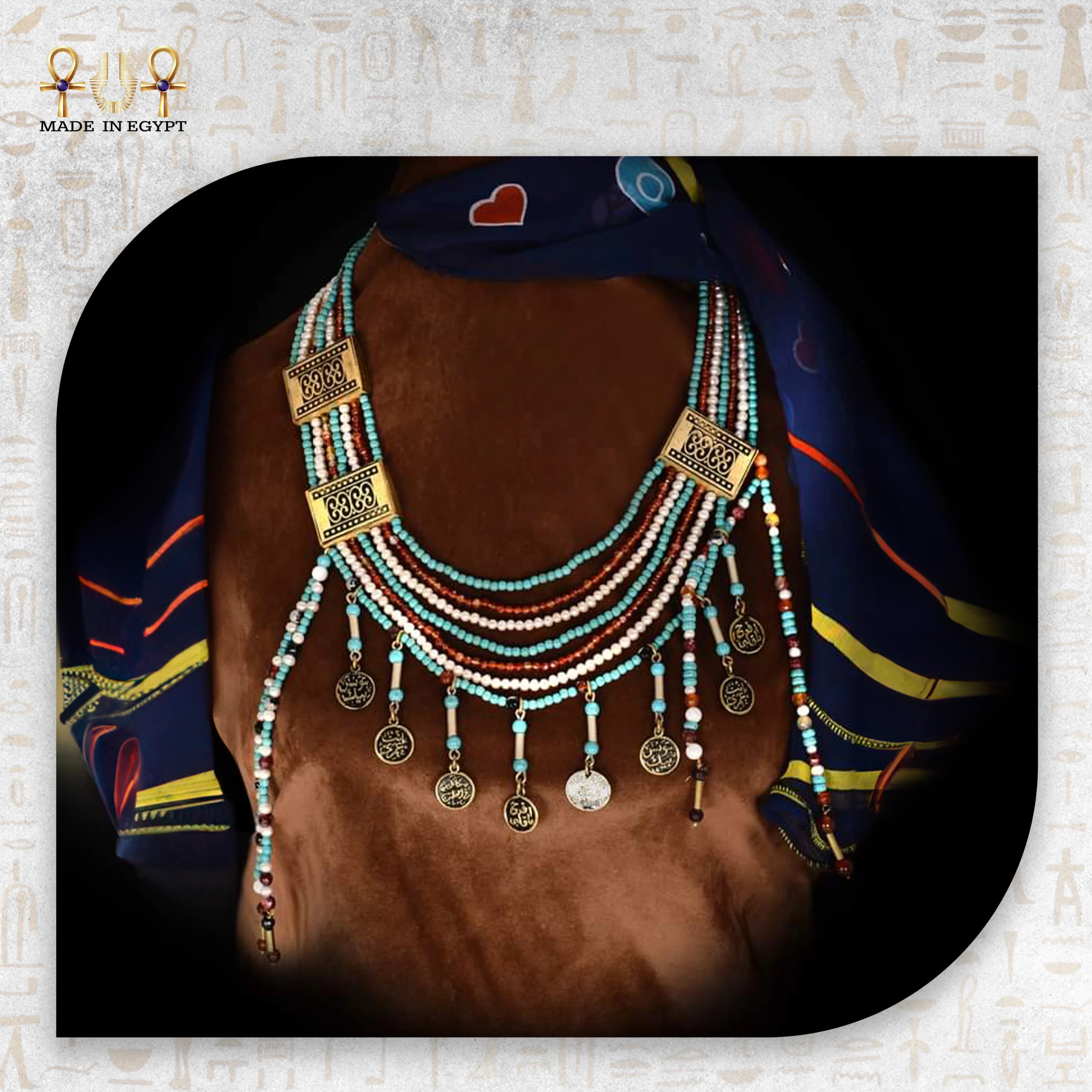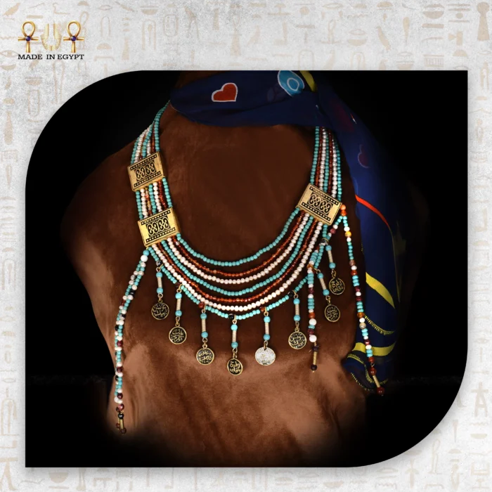 Three main brass components anchor the design. Each piece is crafted from pure brass and engraved with detailed Arabic patterns. These motifs strengthen the cultural character of the collar and add architectural structure. Because of their placement, the brass pieces guide the rhythm of the necklace and highlight its handcrafted origin. From the lower layers hang brass coin charms that move softly and create a gentle rhythm. These charms add sparkle and echo the spirit of classical Arabian jewelry.