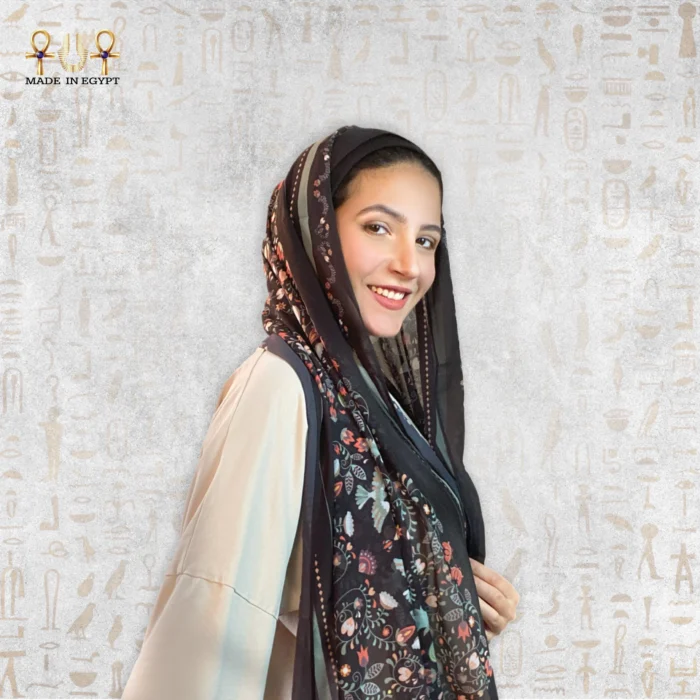 The hijab features an intricate floral pattern on a deep black base, enriched with subtle geometric elements. The combination of warm, colorful tones and delicate embroidery adds a modern yet timeless appeal. Moreover, the design’s balance between simplicity and refinement allows it to pair effortlessly with casual and formal outfits alike. Every detail, from the miniature blossoms to the fine outlines, reflects exquisite craftsmanship.