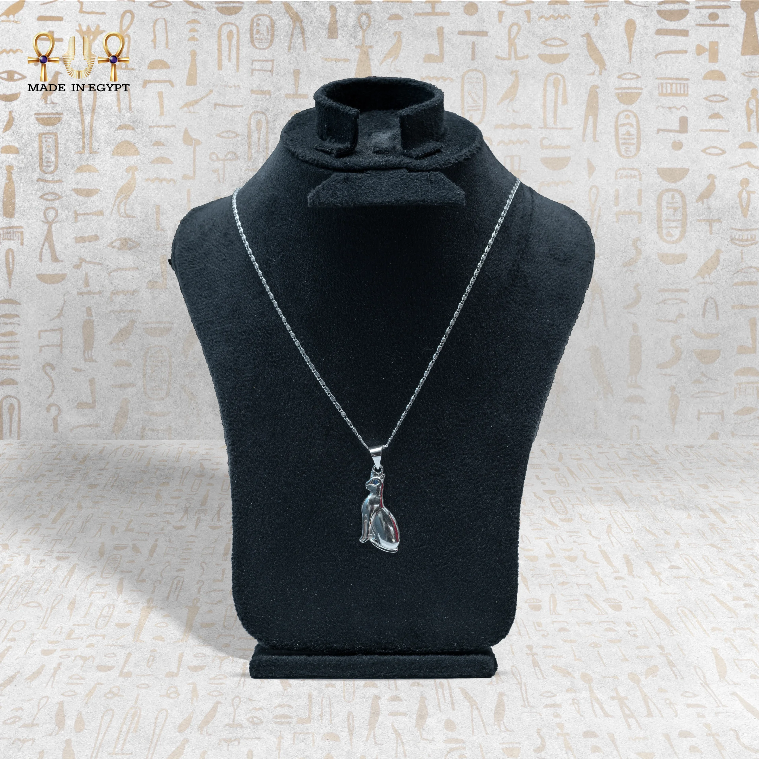 Authentic Egyptian silver necklace featuring Bastet, the goddess of protection and beauty in ancient Egypt, handcrafted with high precision.