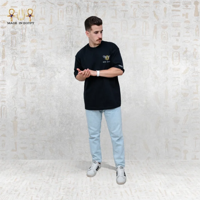 The embroidered golden bee at the chest brings warmth and brightness to the design. Accompanied by the message “BEE KIND,” it adds a thoughtful and motivational touch. Each stitch reflects fine Egyptian craftsmanship and attention to detail, ensuring that the embroidery remains vibrant and elegant. In addition, the subtle contrast between the golden thread and the neutral background gives the T-shirt a refined yet cheerful appearance.