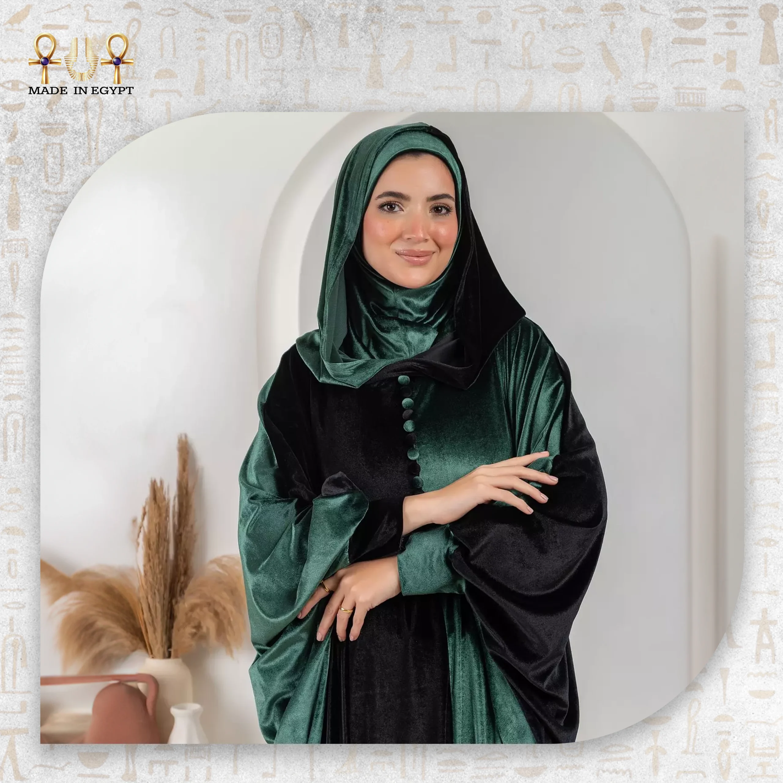 Bicolour velvet abaya with a luxurious design that combines elegance and comfort, featuring an attached headscarf and a hoodie for a modern, distinctive look.