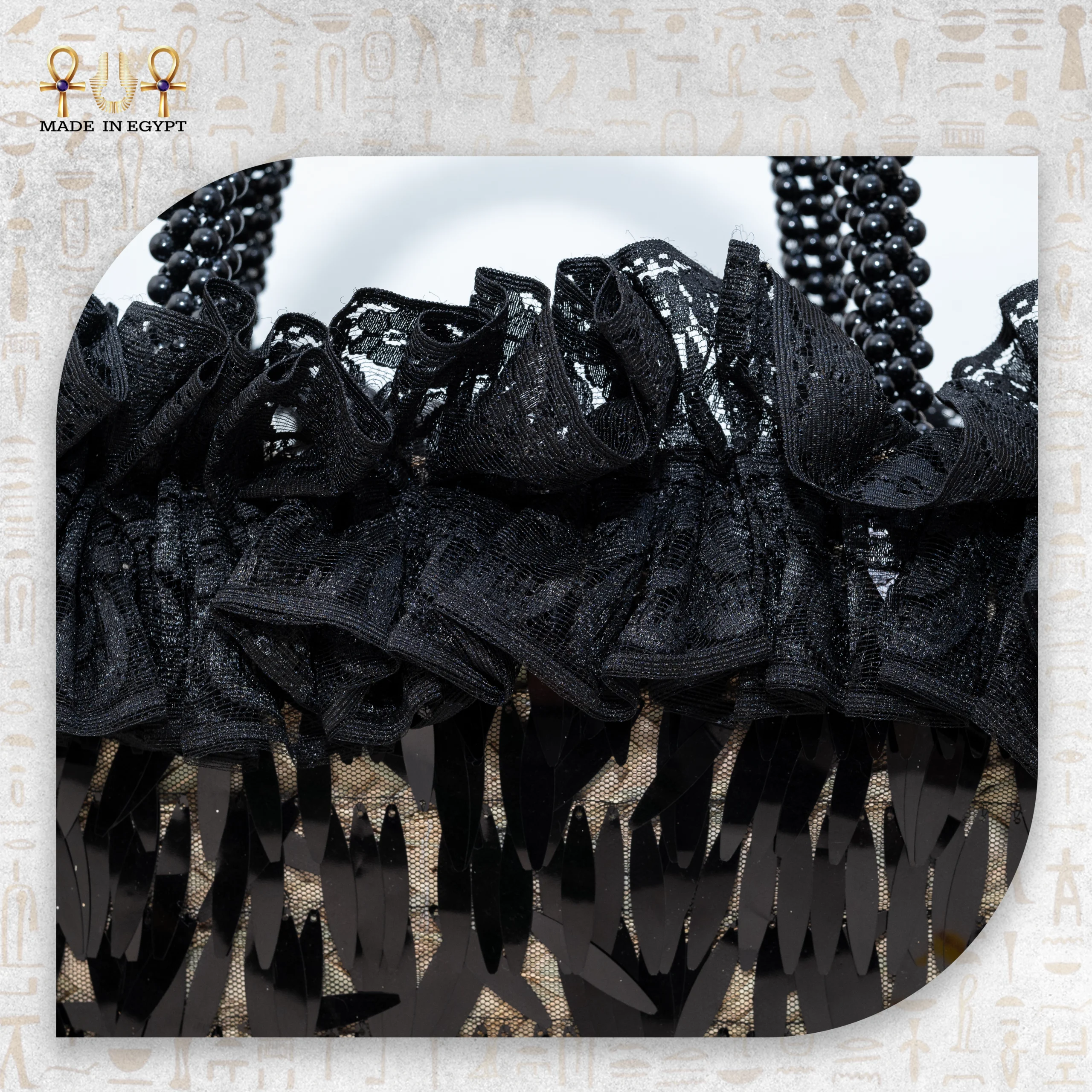 The front features black soirée fabric layered with rich lace that adds depth and feminine volume. Soft ruffles create movement and drama. Below the lace, shimmering black fringes add a bold touch, catching the light beautifully and enhancing the evening style.