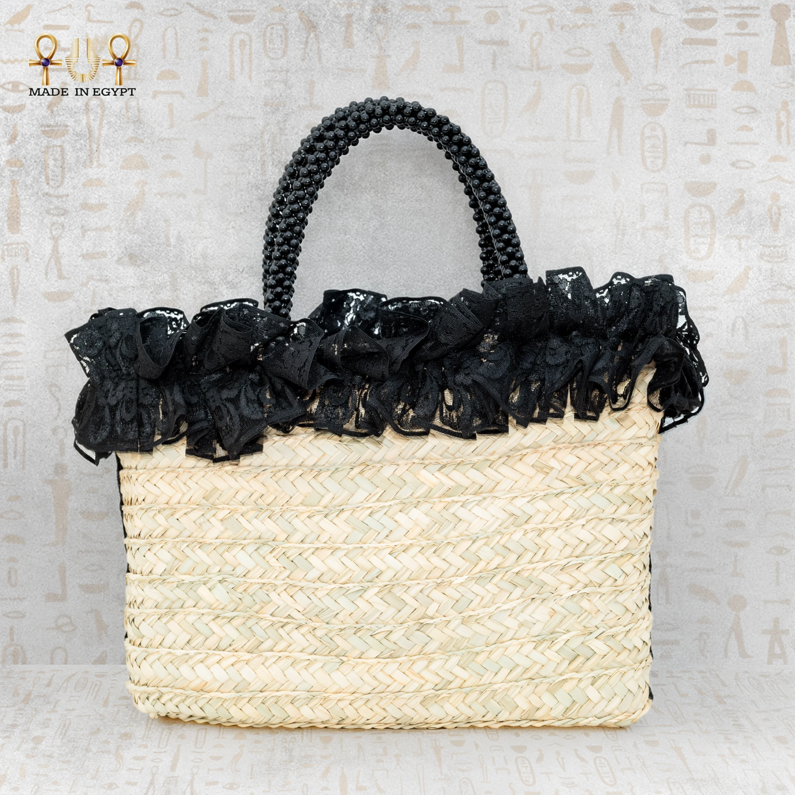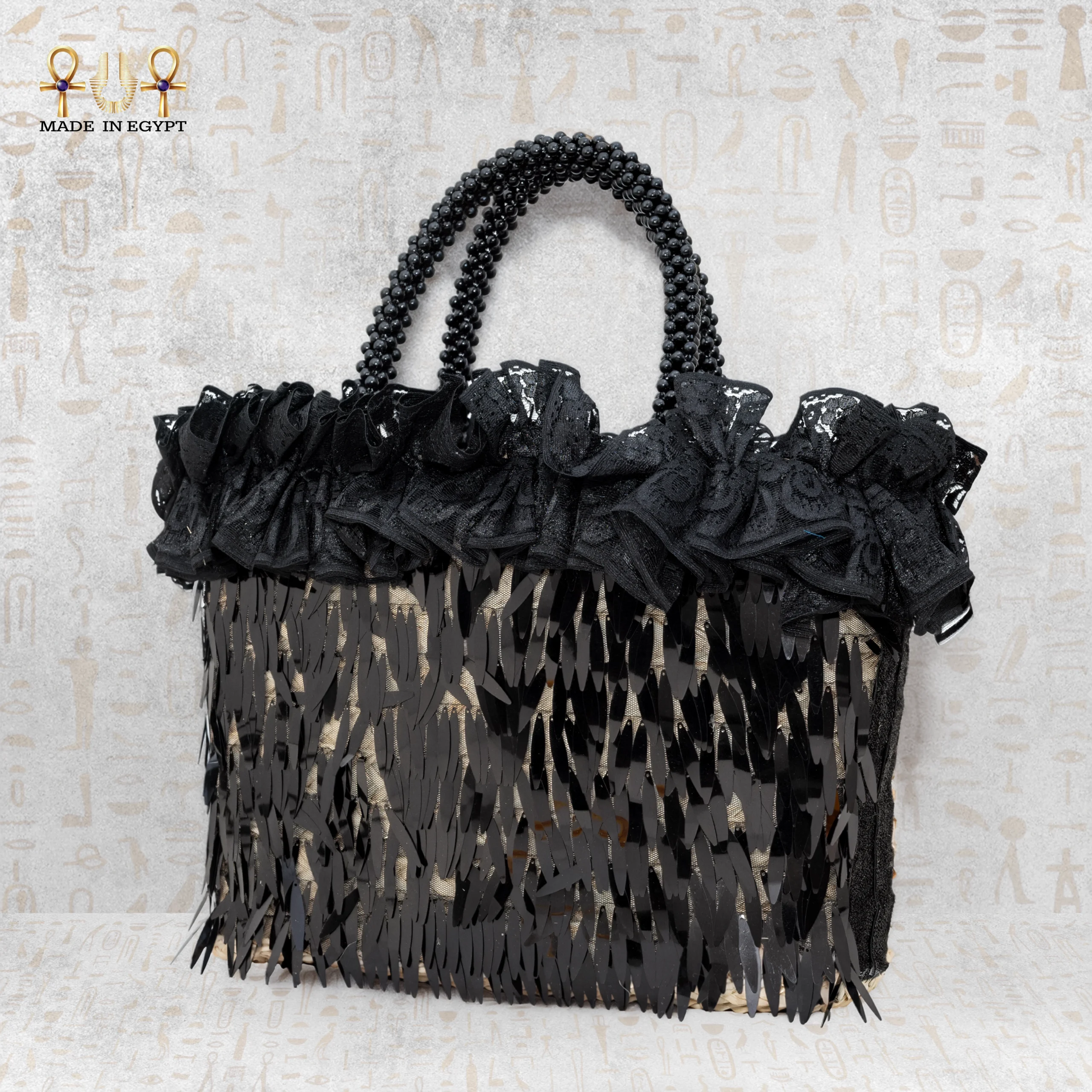 A hand-woven palm evening bag adorned with black lace ruffles, shimmering fringes, and a glossy pearl handle.