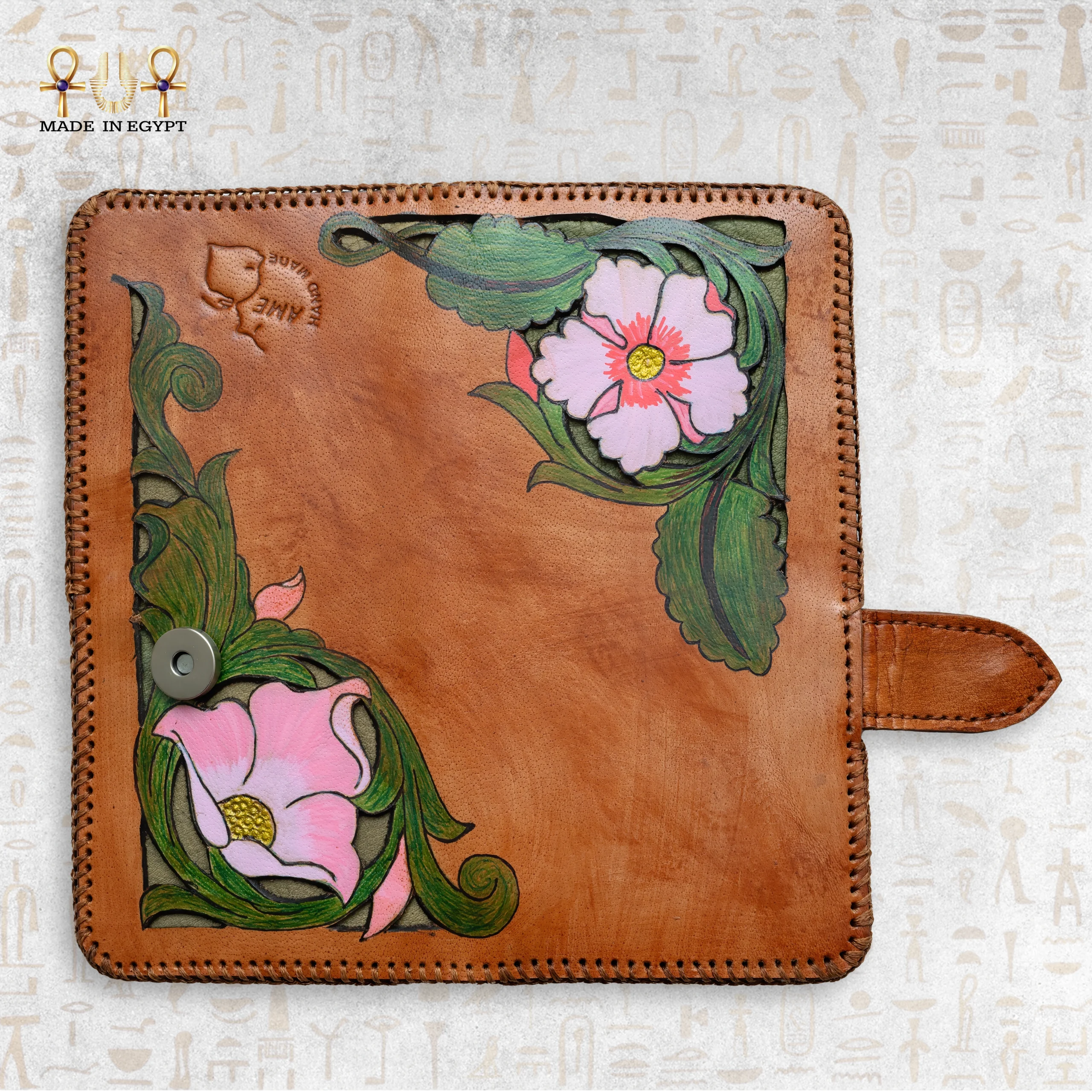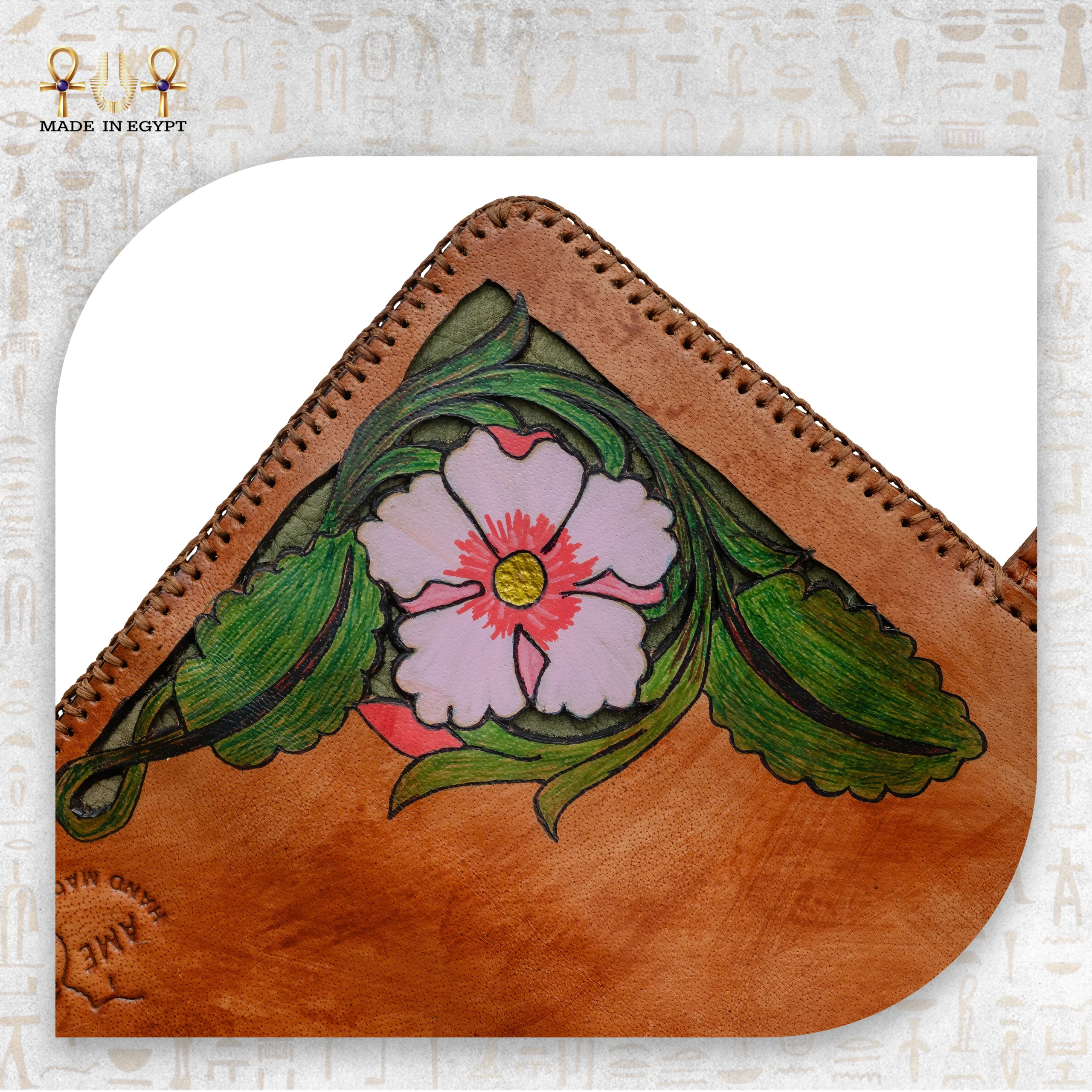 Radiant and deeply rooted in tradition, The Blossom of Light Wallet Egypt celebrates nature, femininity, and the timeless art of Egyptian craftsmanship. Crafted from high-quality brown leather, it becomes a living canvas—graced with hand-painted florals in soft pinks and leafy greens. More than just an accessory, it serves as a poetic expression of renewal, grace, and quiet strength.