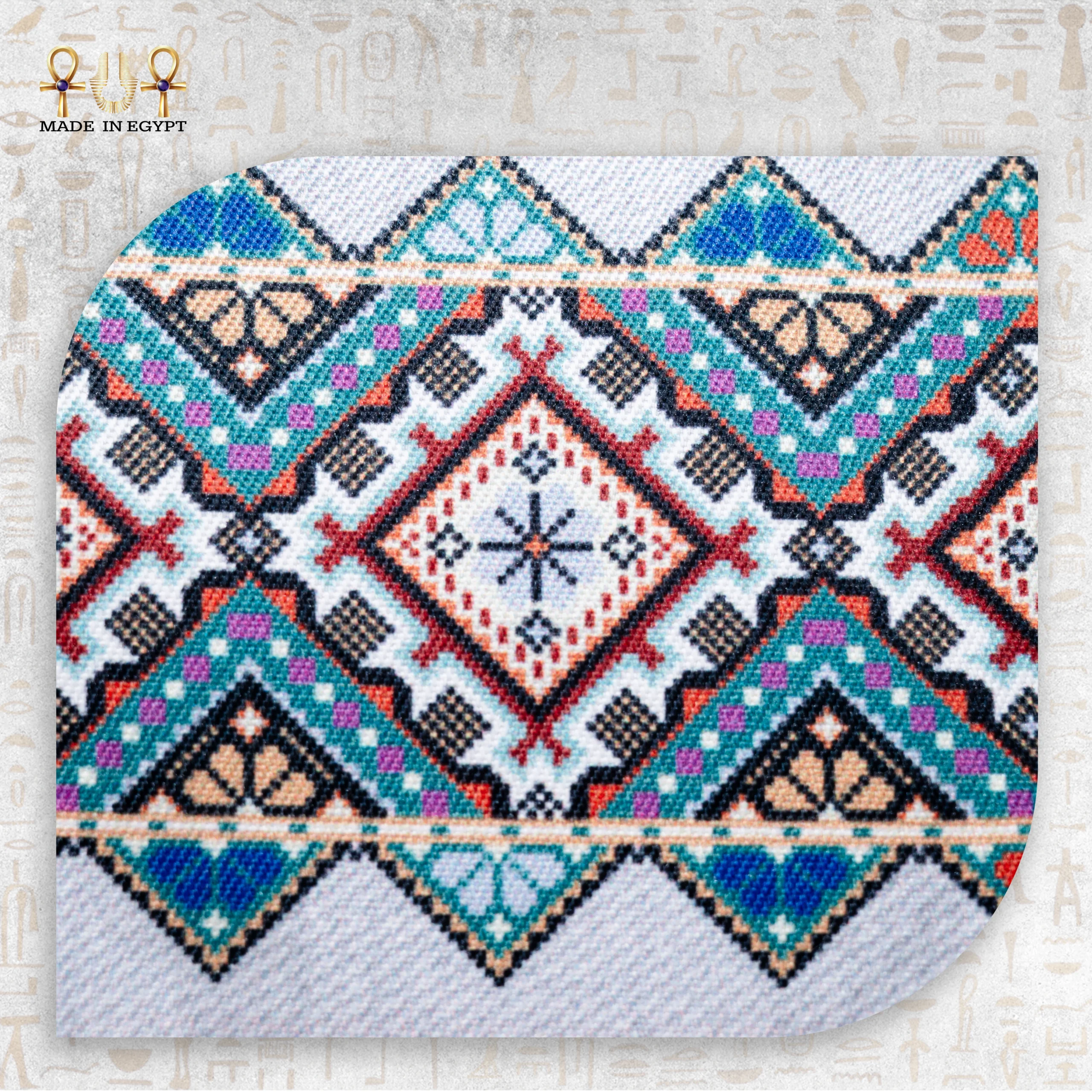 Each line and shape reflects careful symmetry and artistic precision. These details give the bag a sense of timeless charm. The light-colored fabric forms a clean base, allowing the embroidery-style pattern to stand out with vibrant contrast.