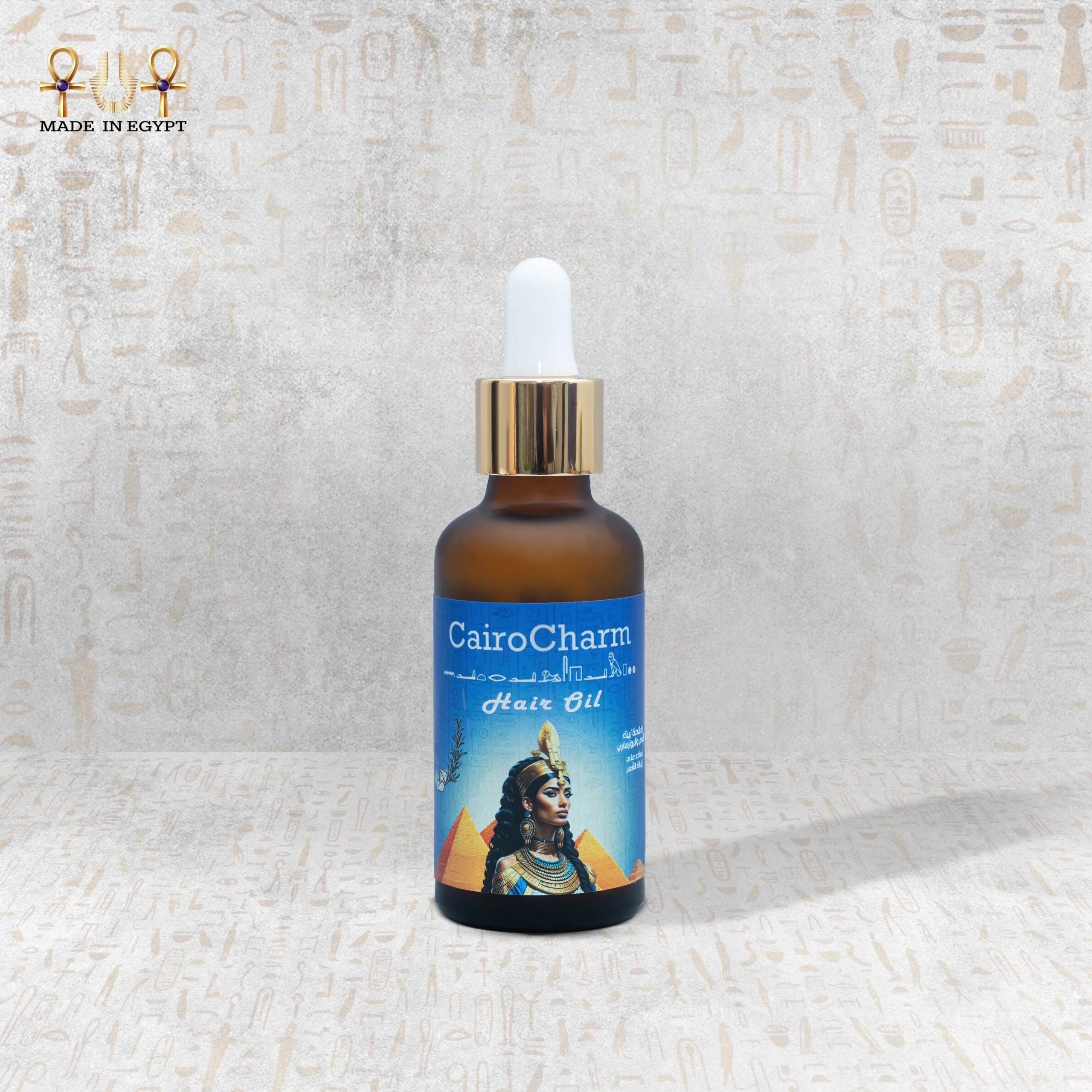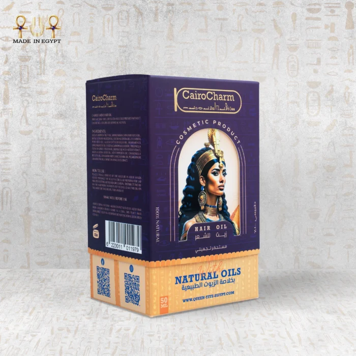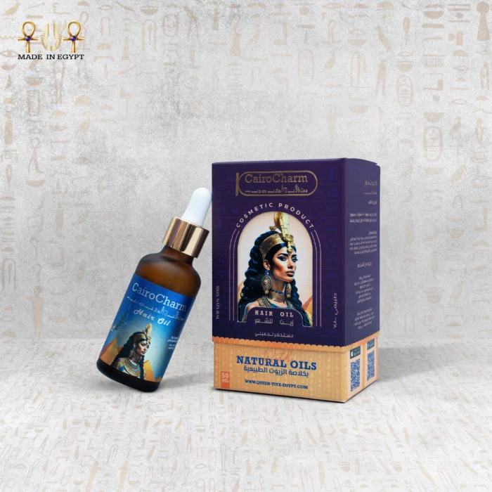 CairoCharm Hair Oil for Dry Hair with elegant packaging, featuring an Egyptian-inspired design and 50ml bottle.