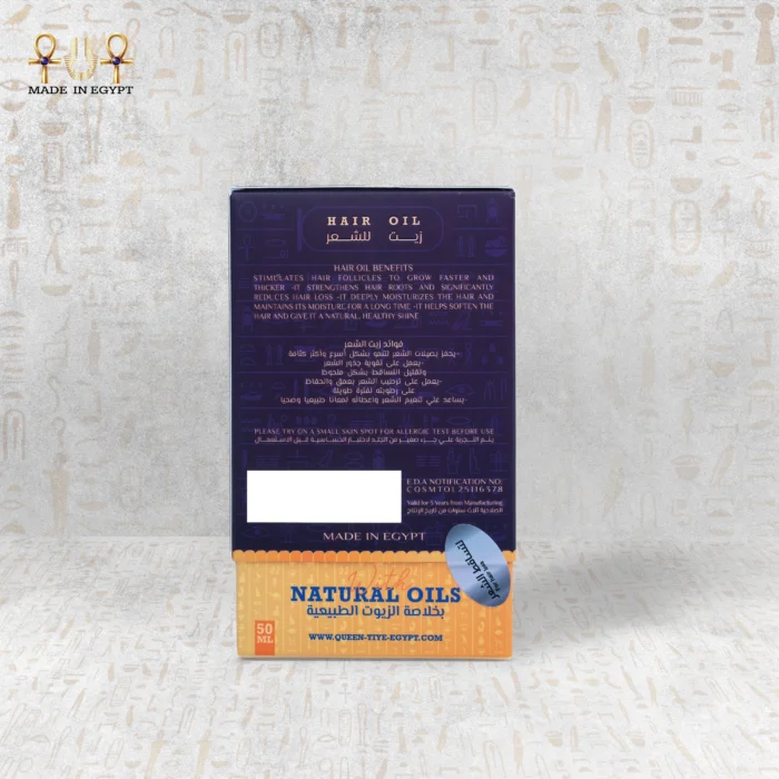 The method of use is simple and effective: shake the bottle well, place a small amount of oil in your hands, and warm it gently. Then, massage the scalp in gentle circular motions for five to ten minutes to stimulate blood circulation and ensure nutrients reach the follicles. After that, distribute the oil evenly from the roots to the ends of the hair, leave it on for two hours, and then wash it off with a mild shampoo to fully benefit from its properties. Avoid contact with the eyes. For external use only. Keep out of children’s reach and store in a cool, dry place away from direct sunlight at a temperature not exceeding 30°C.