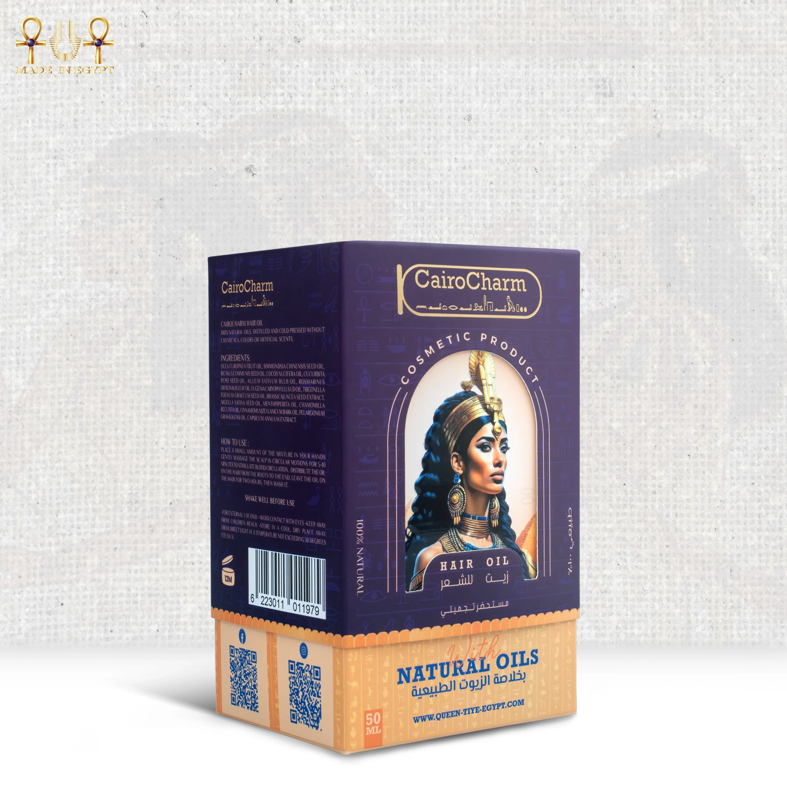 CairoCharm Hair Oil bottle with packaging, placed next to the product box.