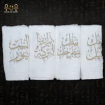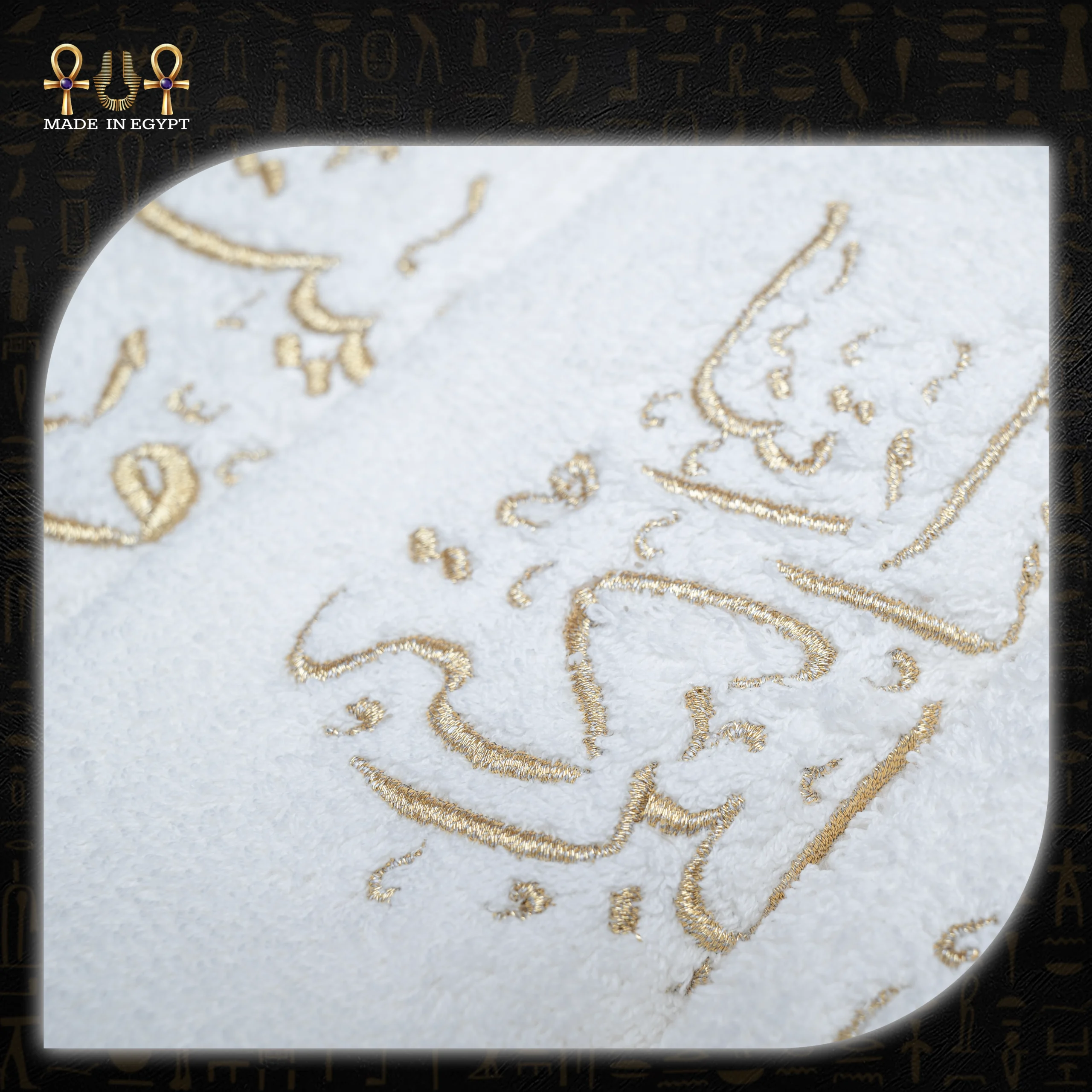 Each towel features delicate golden Arabic calligraphy embroidery, adding a graceful touch of cultural richness and hospitality. The white cotton base, paired with golden thread, creates a pure and elegant aesthetic that enhances any bathroom or guest space.