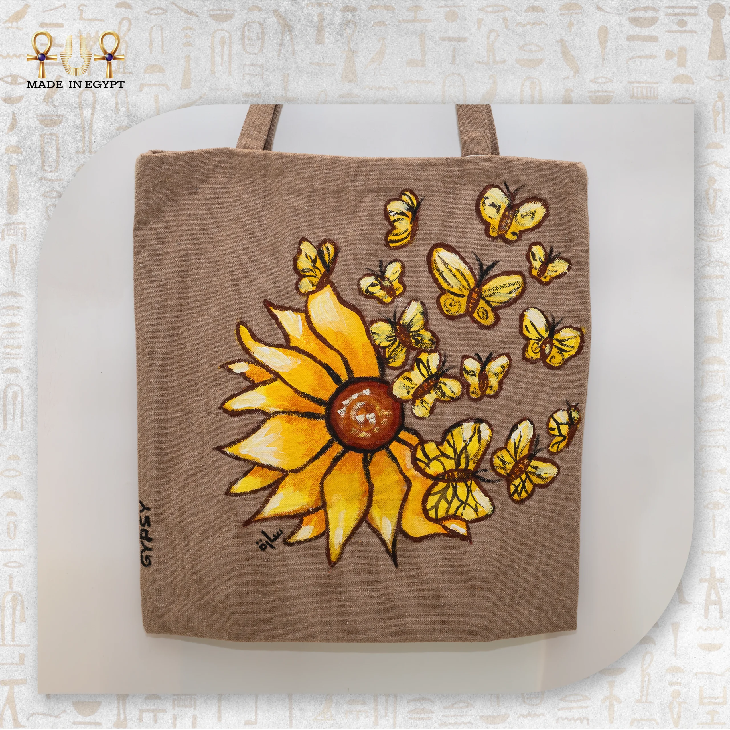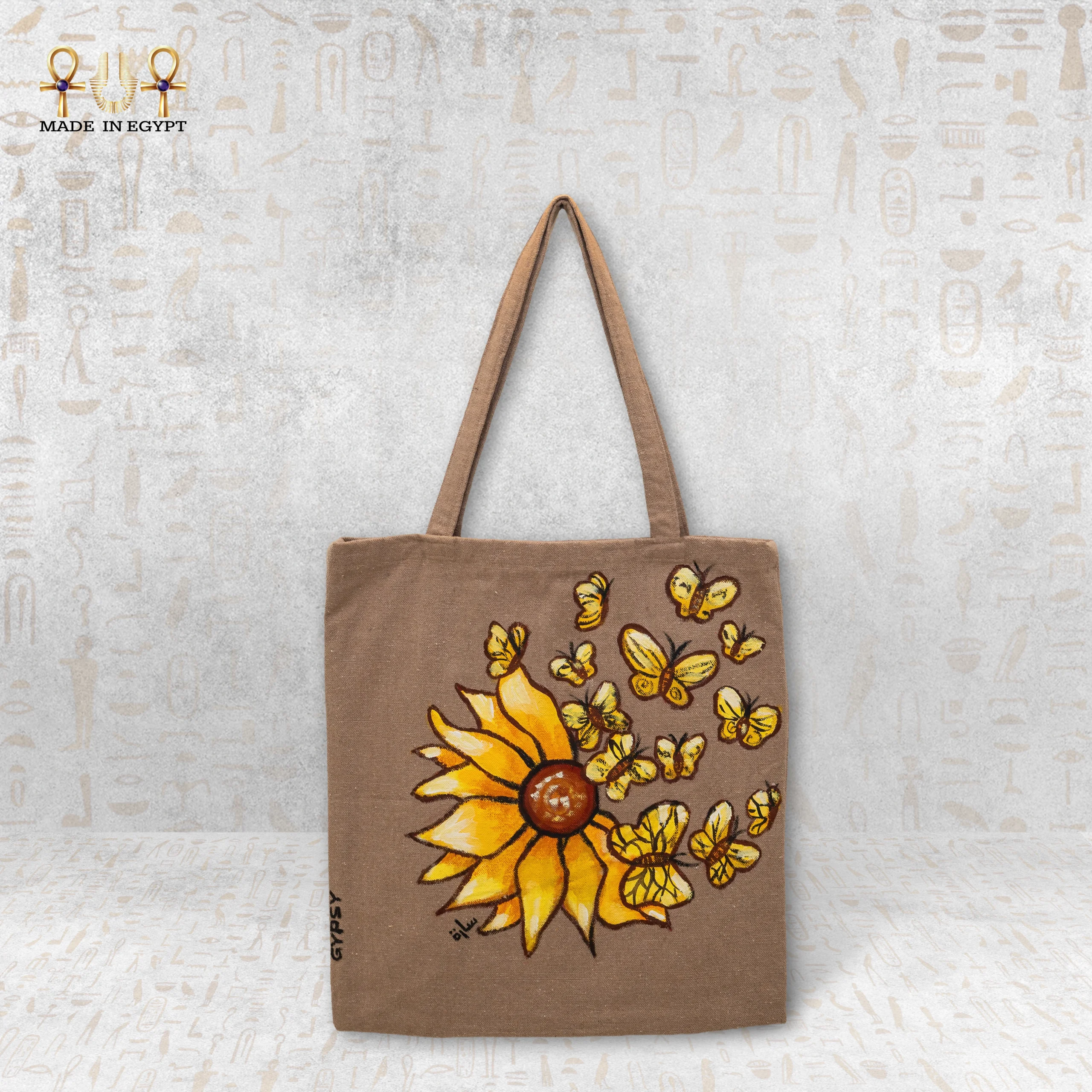 A canvas bag with an artistic design of a sunflower and butterflies, a wonderful addition to your daily look. It takes 3 days to complete.