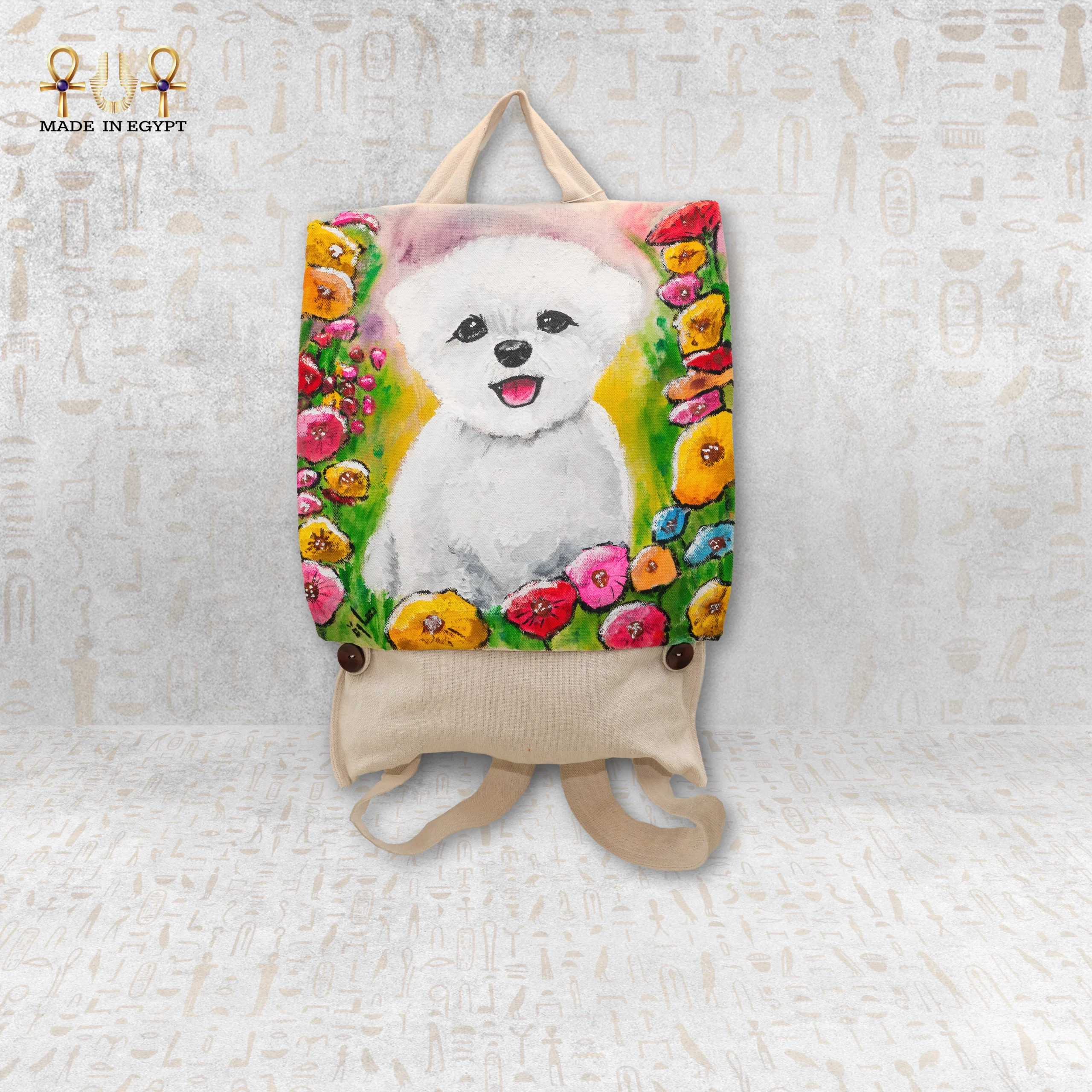 A bag with an artistic design of a cheerful pup surrounded by colorful flowers, adding a touch of joy and vibrancy to your daily look. It takes 7 days to complete.