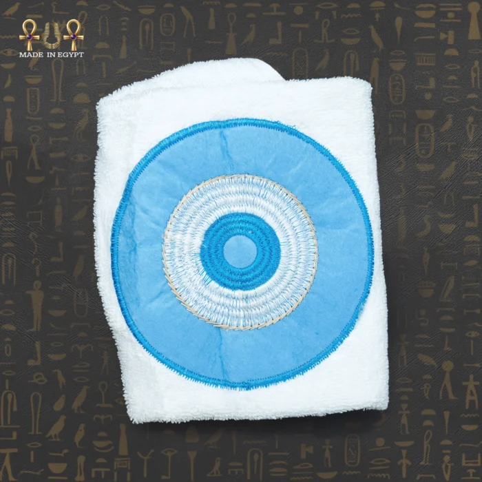 Two Egyptian cotton towels with handmade embroidery of a distinctive blue circle. A modern and elegant design suitable for daily use.
