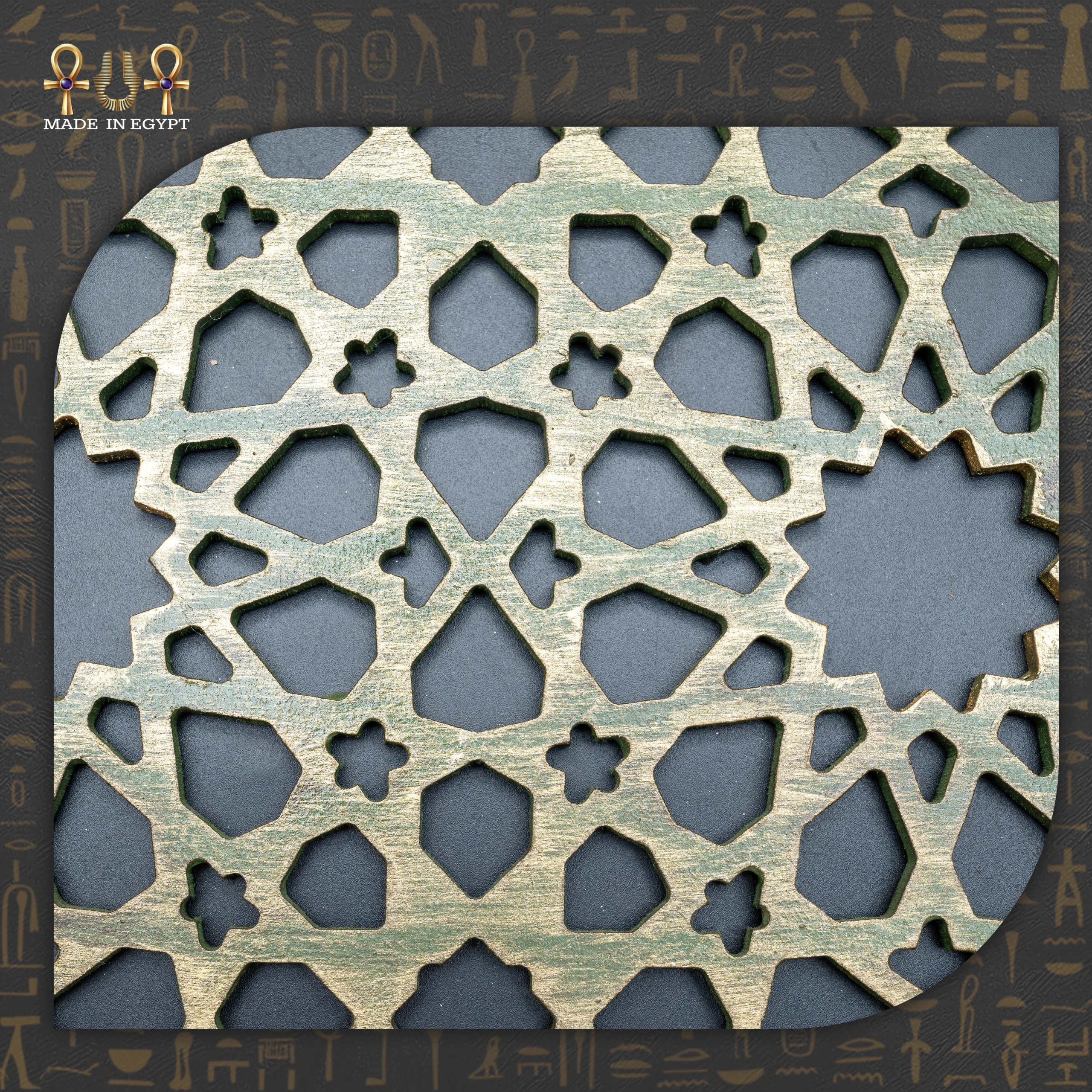 The tray features an intricate cutwork pattern, highlighting the harmony and precision of traditional arabesque motifs. The olive green interior adds a touch of calm sophistication, while the distressed brown outer frame brings warmth and classic character to the design.