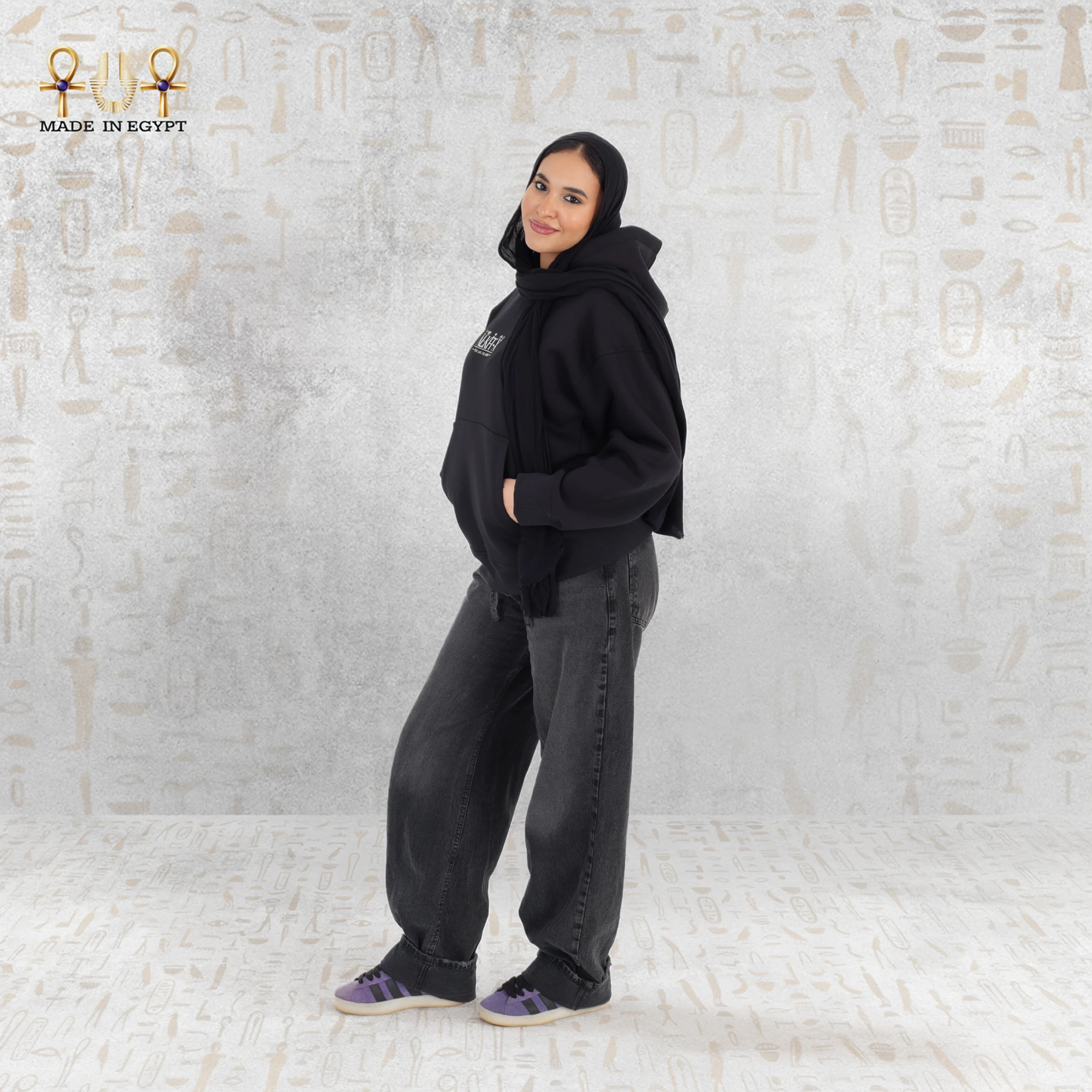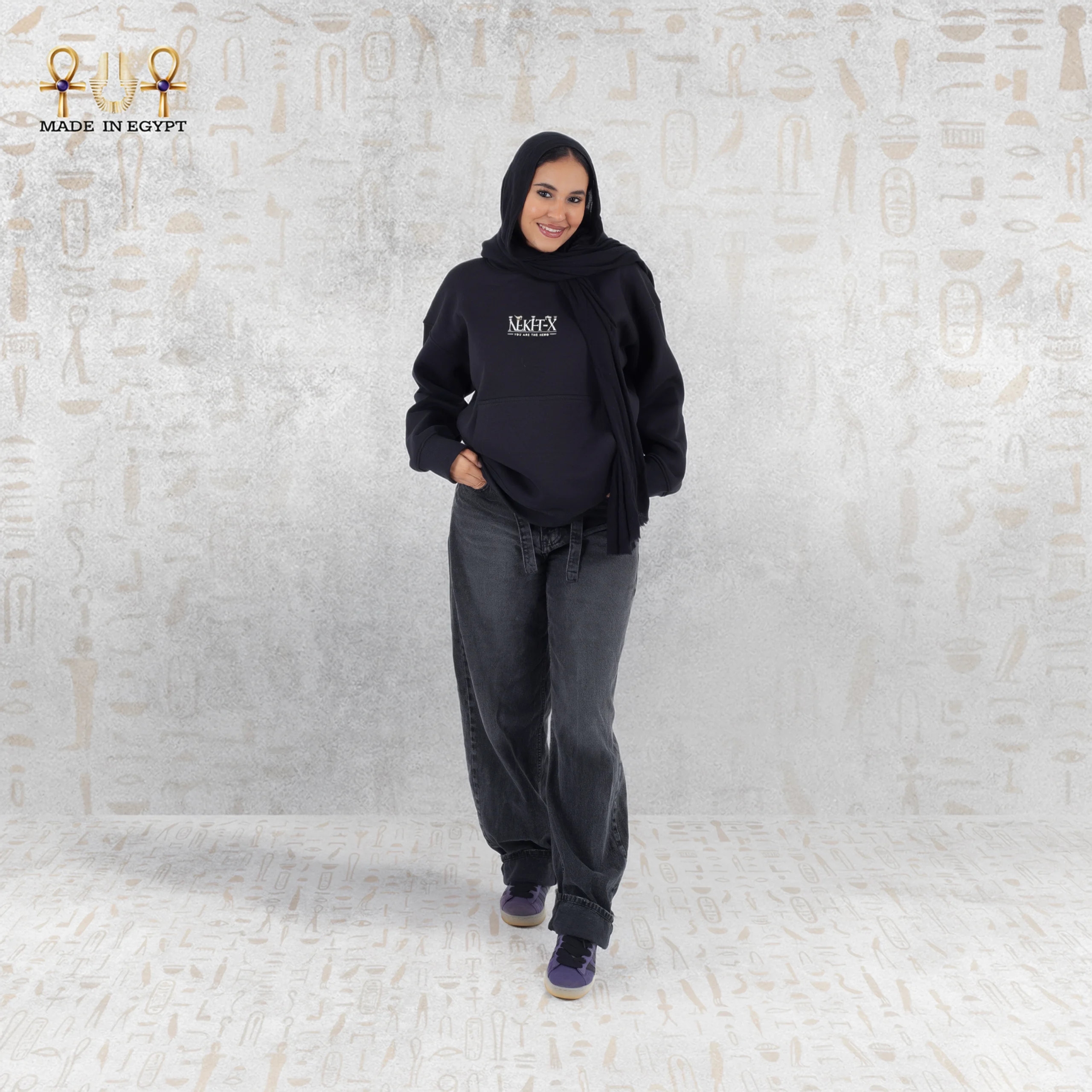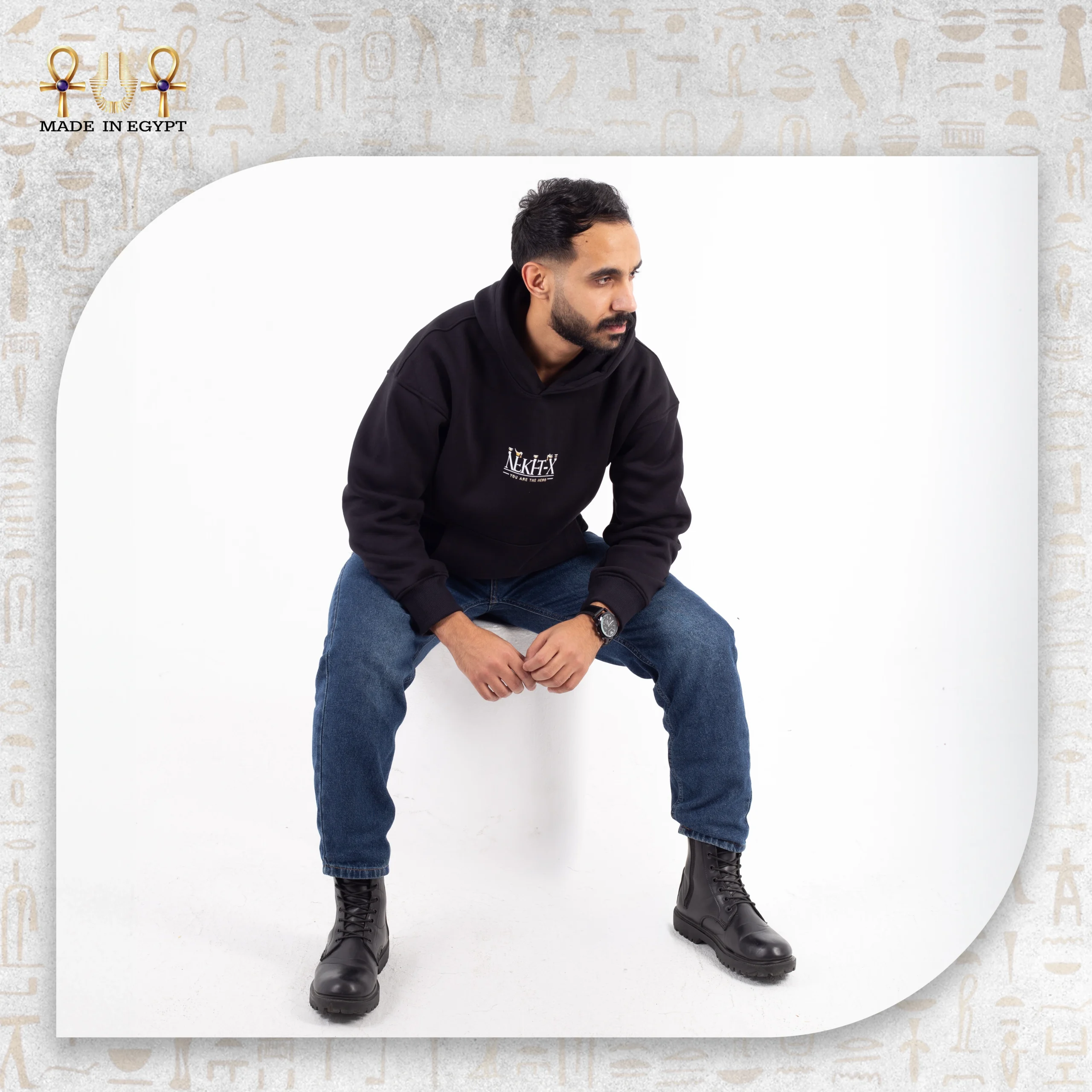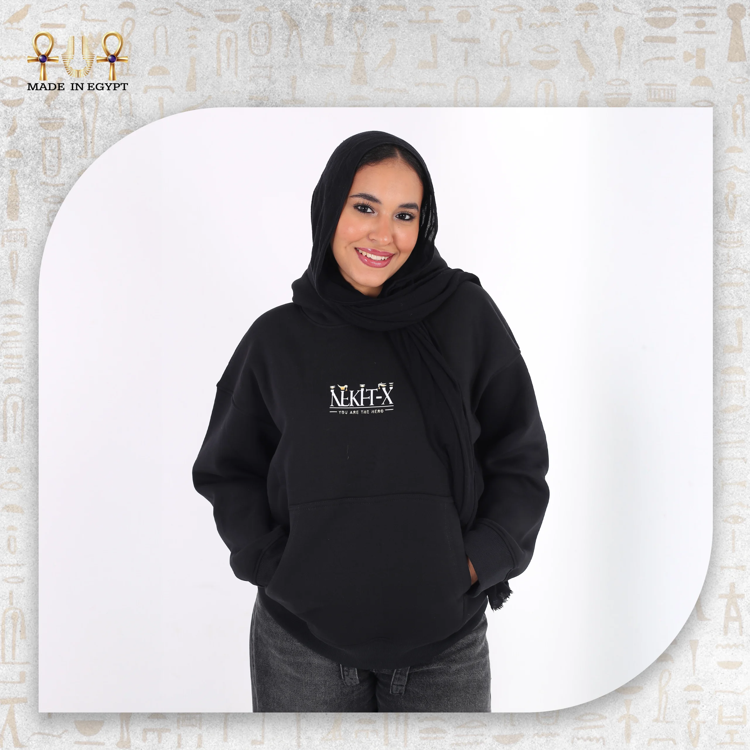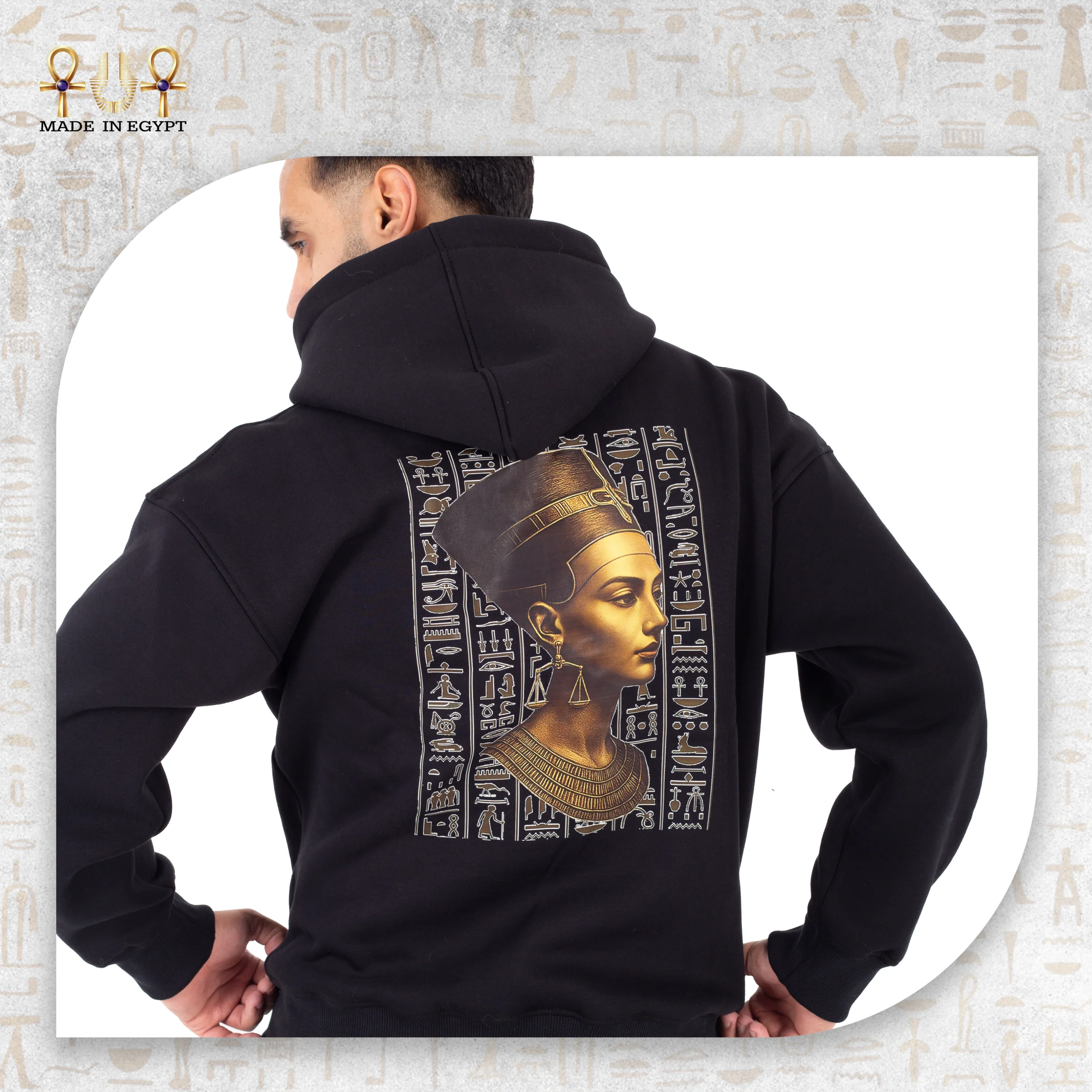 A black hoodie featuring a gold Nefertiti design that blends ancient Egyptian heritage with modern streetwear. Comfortable, bold, and unisex.