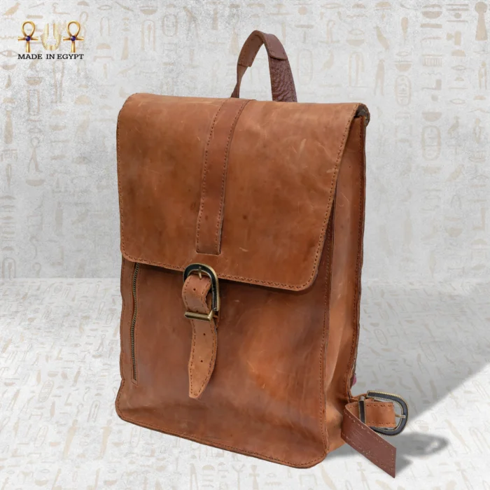 Handmade brown genuine leather backpack with vintage buckle — elegant, durable, and proudly made in Egypt.