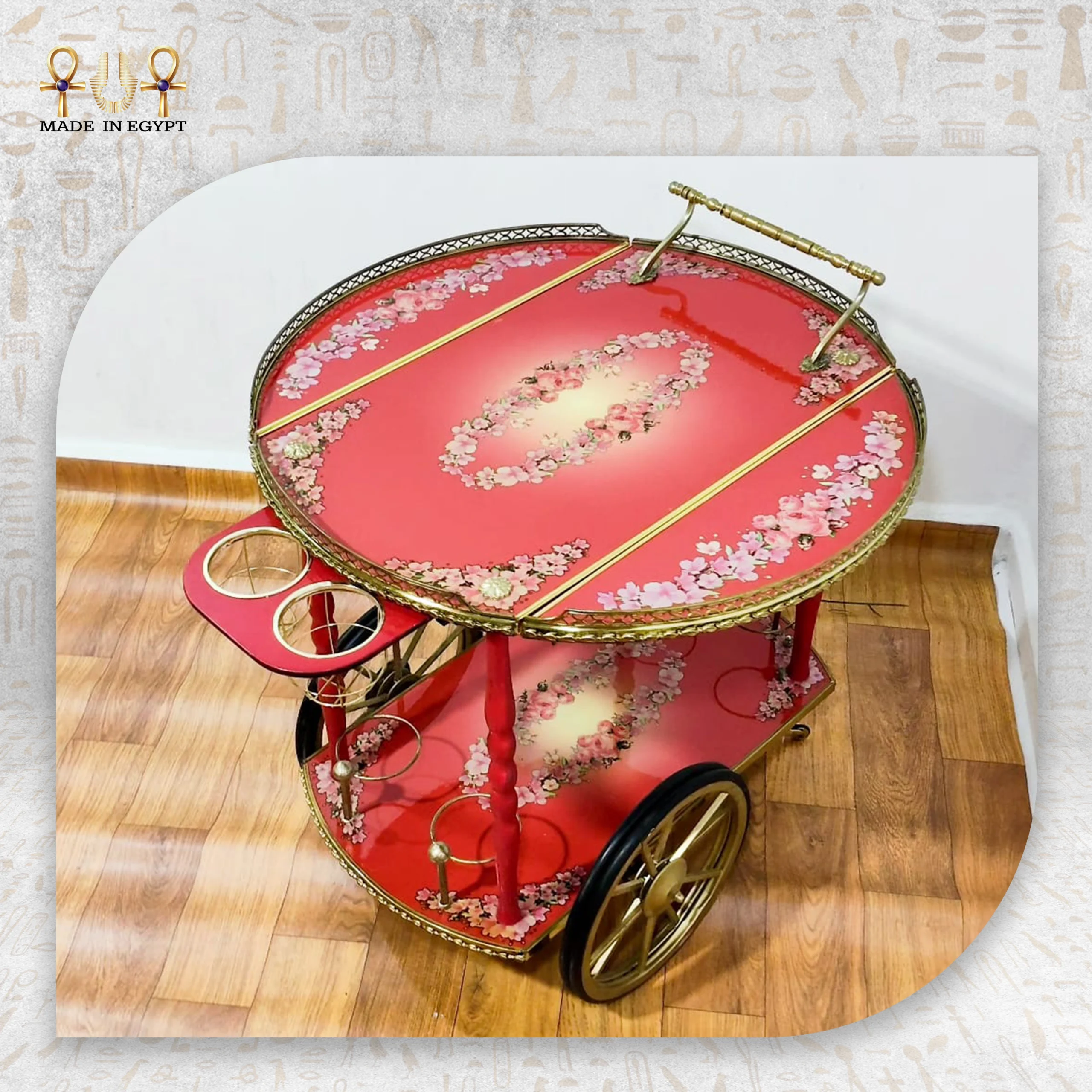 A luxurious marquetry serving cart in royal red with brass inlay, made from Banoh wood and coated with water-resistant resin. Easy to move and available in round and rectangular tray designs.