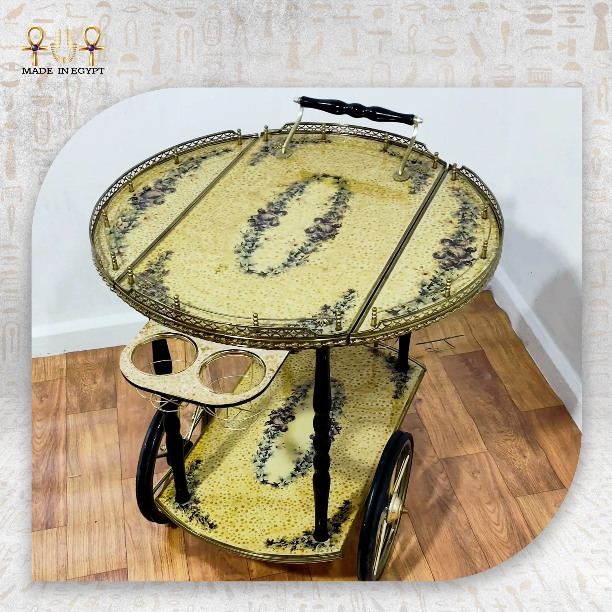 Artisans design the surface using premium marquetry veneer. They carefully arrange small wood pieces into detailed patterns inspired by classic and natural motifs. This handcrafted technique adds depth and gives the cart a unique artistic identity. Each detail reflects precision and craftsmanship.