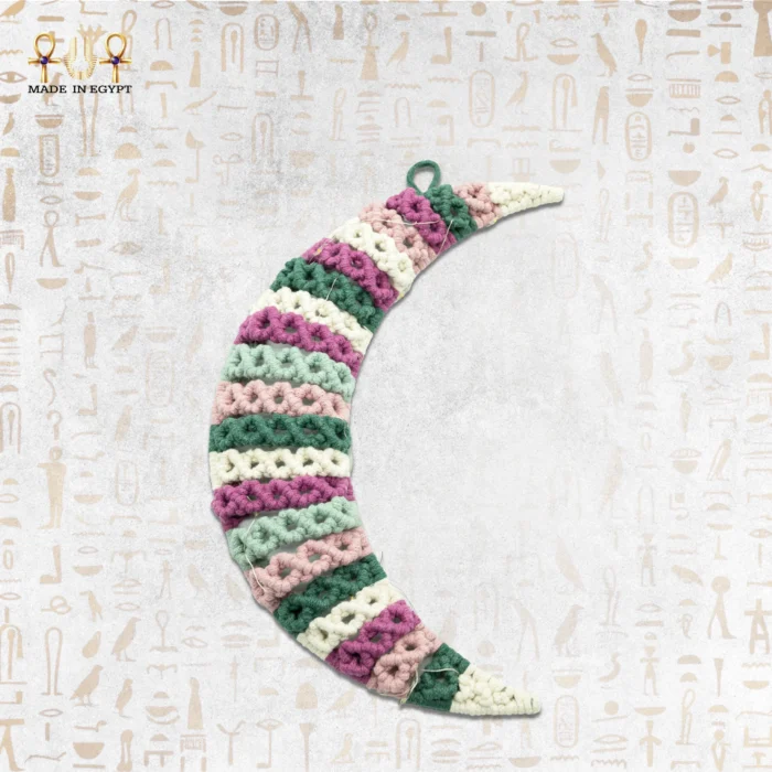 The Color Moon macramé crescent is a handcrafted decorative piece that combines vibrant modern aesthetics with traditional Egyptian artistry. Skilled artisans weave natural cotton cords into delicate stripes of green, pink, purple, and cream, creating a cheerful accent that brings life to any room.