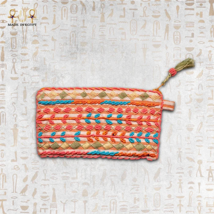 A beaded, hand-embroidered handbag in coral, turquoise, and orange, reflecting Egyptian craftsmanship with a striking textured feel and an elegant tassel. Lightweight and practical with a secure zipper; fits a phone, cards, and keys, and can be carried as a clutch or placed inside a larger bag