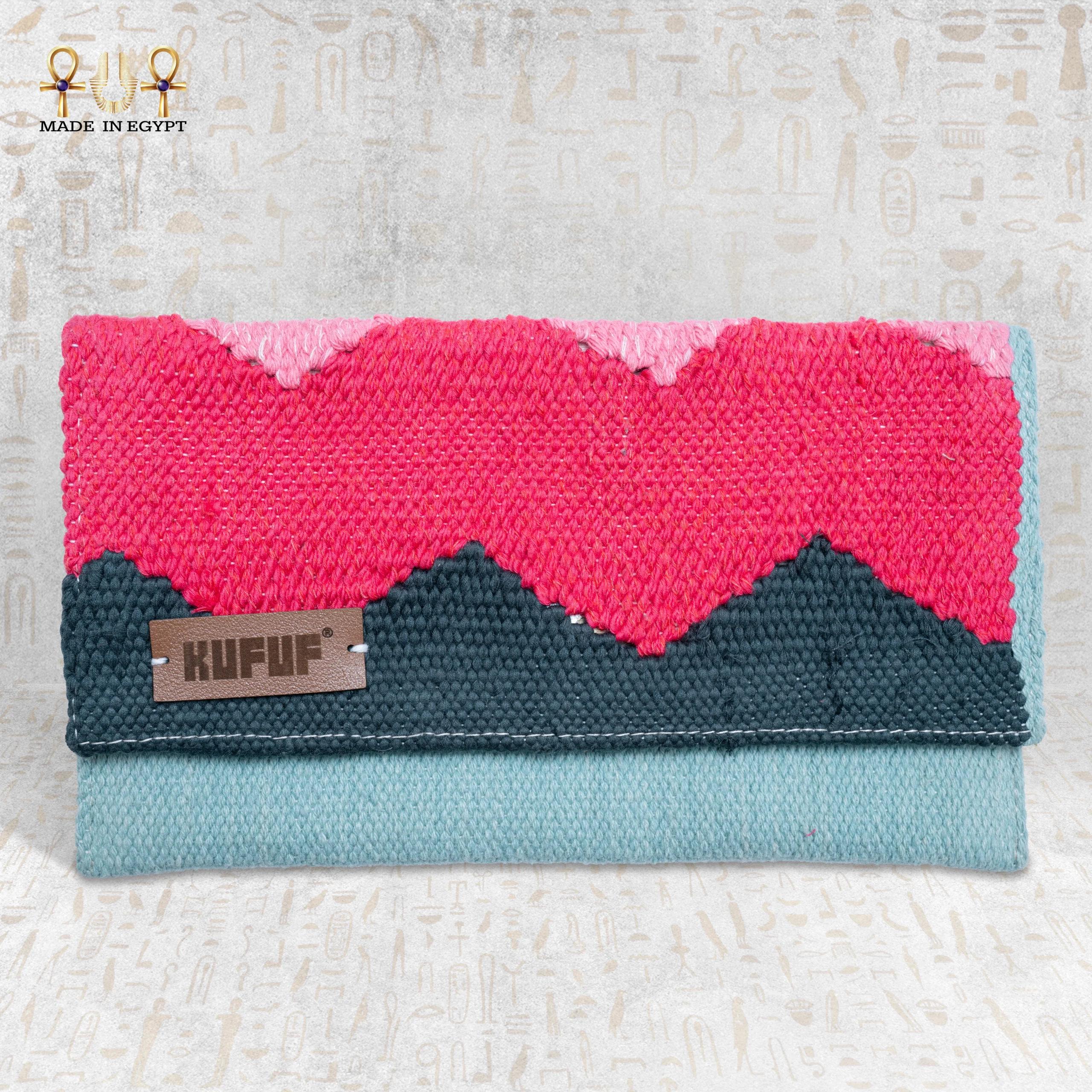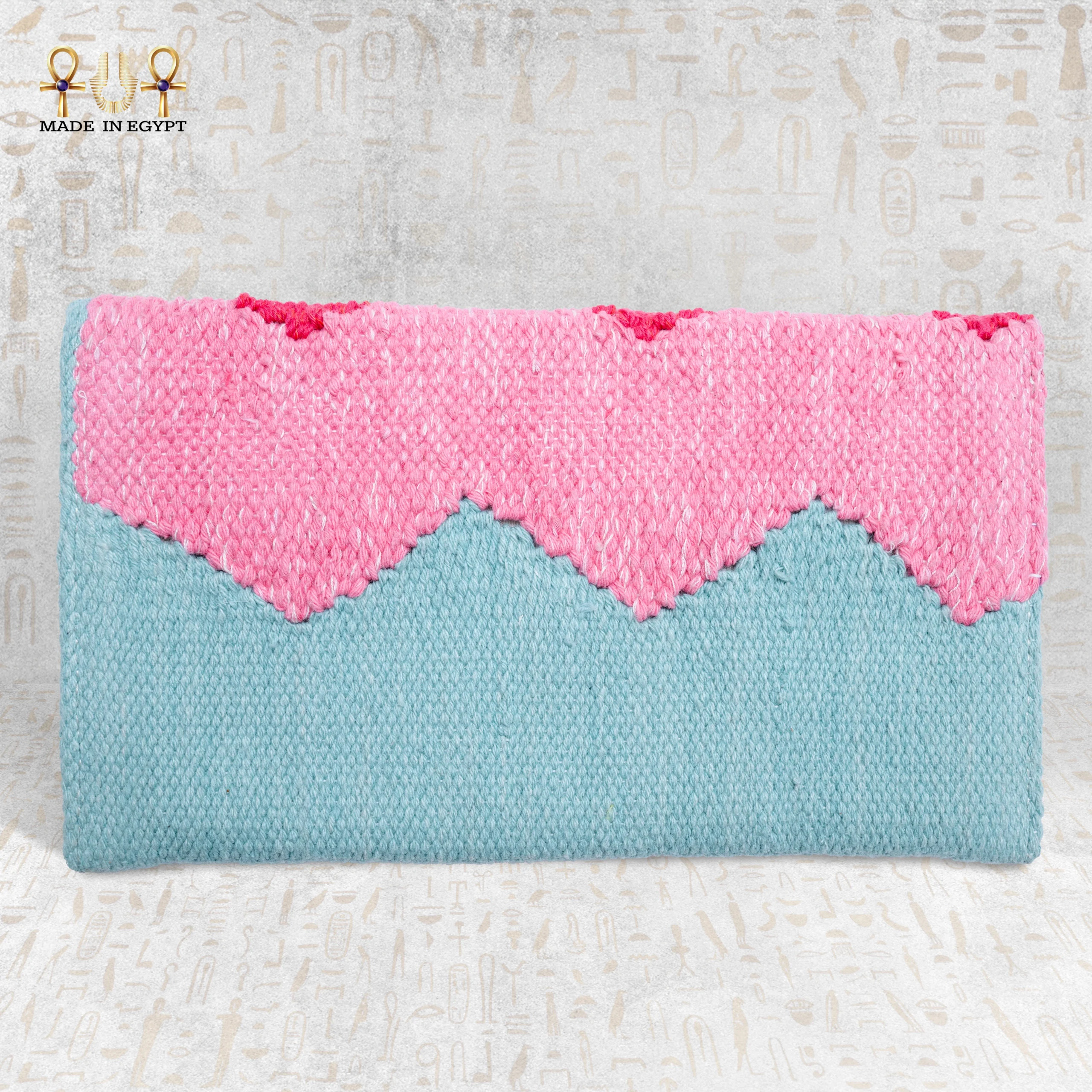 Each Cotton Candy Sunset Clutch is meticulously handwoven by Egyptian artisans using 100% natural cotton threads. Sitting by traditional looms, they weave strands of pink for warmth and blue for tranquility, merging them in perfect harmony. The zigzag meeting of both colors mirrors the horizon where the sea meets the sky, symbolizing unity and peace. Moreover, every weave tells a story — one of patience, love, and artistic intuition passed down through generations.