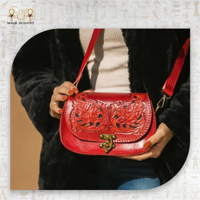 A handcrafted red leather shoulder bag featuring fully hand-carved floral artwork, hand stitching, and natural full-grain cowhide leather with soft goat-leather lining. Compact in size yet rich in detail, it blends heritage craftsmanship with practical everyday elegance — a unique piece that ages beautifully with time.
