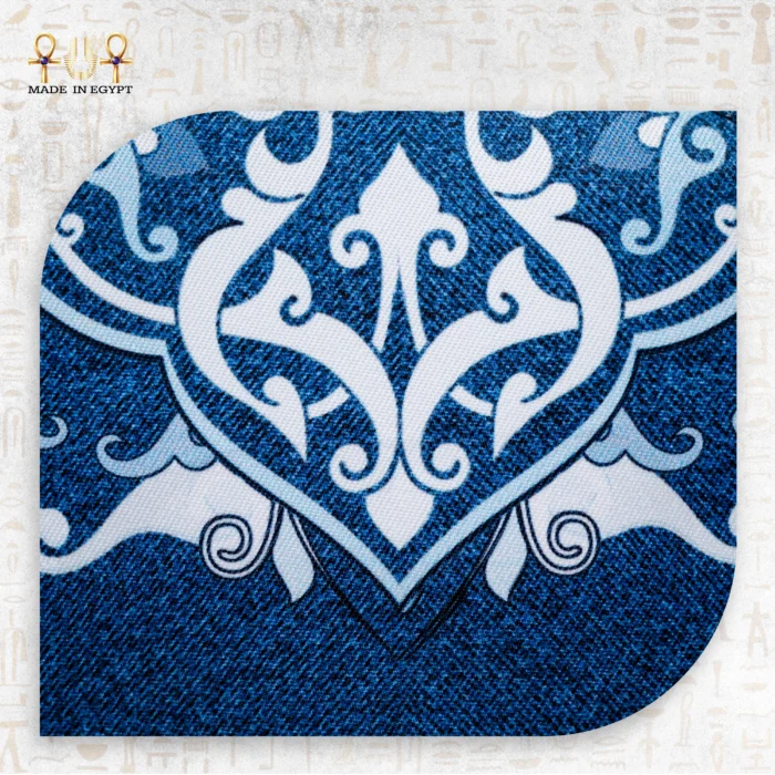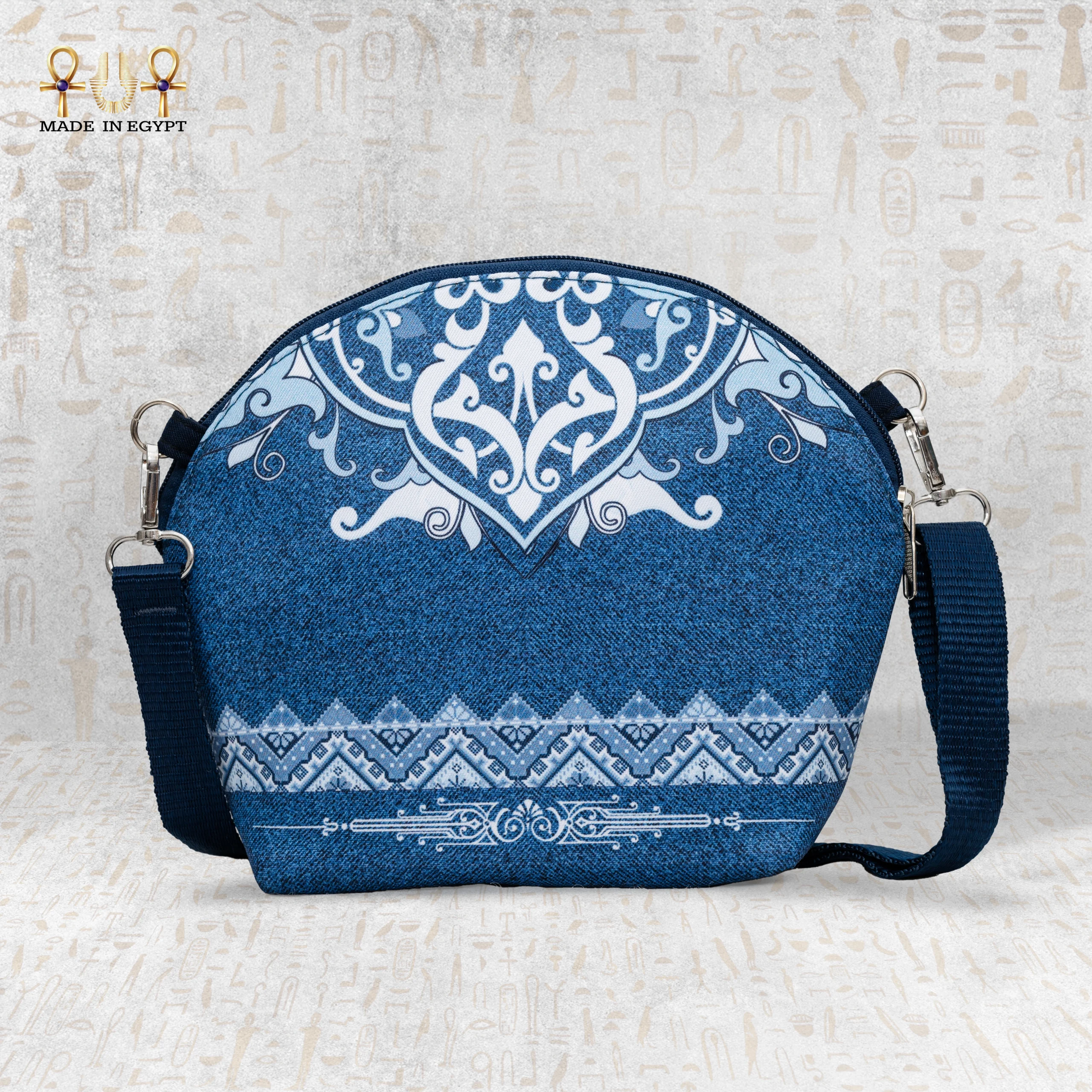 The delicate white ornamental details on the denim background bring an artistic touch to the design, reminiscent of traditional Arab-inspired patterns, giving the bag a unique character that effortlessly stands out. Whether you’re looking for a piece that highlights your refined taste or simply a practical yet stylish accessory, this crossbody bag is designed to meet both needs.