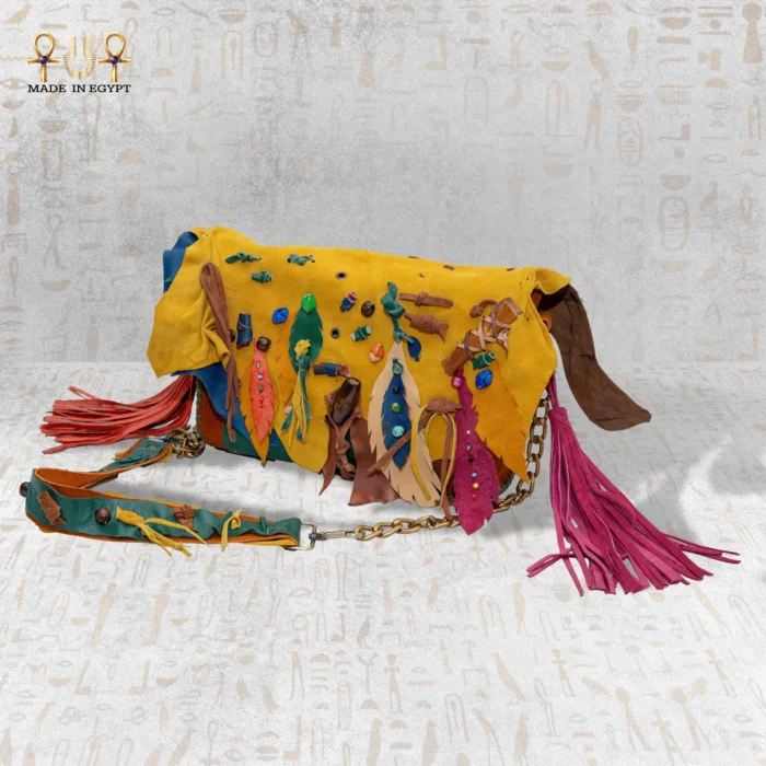A handmade multicolor genuine leather bag inspired by feathers and beads — bold, artistic, and authentically Egyptian.