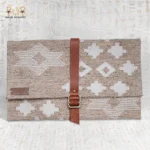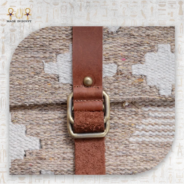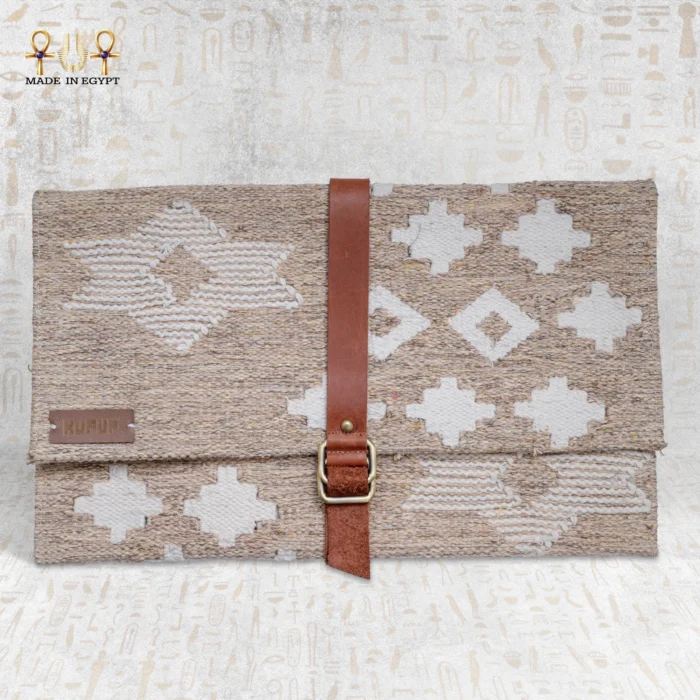 The deep brown leather strap adds both structure and sophistication. It contrasts beautifully with the soft cotton texture, symbolizing the harmony between strength and gentleness. In addition, the golden KUFUF emblem on the front adds a subtle touch of luxury, highlighting authenticity and pride in Egyptian artistry. The clutch’s clean silhouette ensures effortless style, whether carried by hand or tucked under the arm.