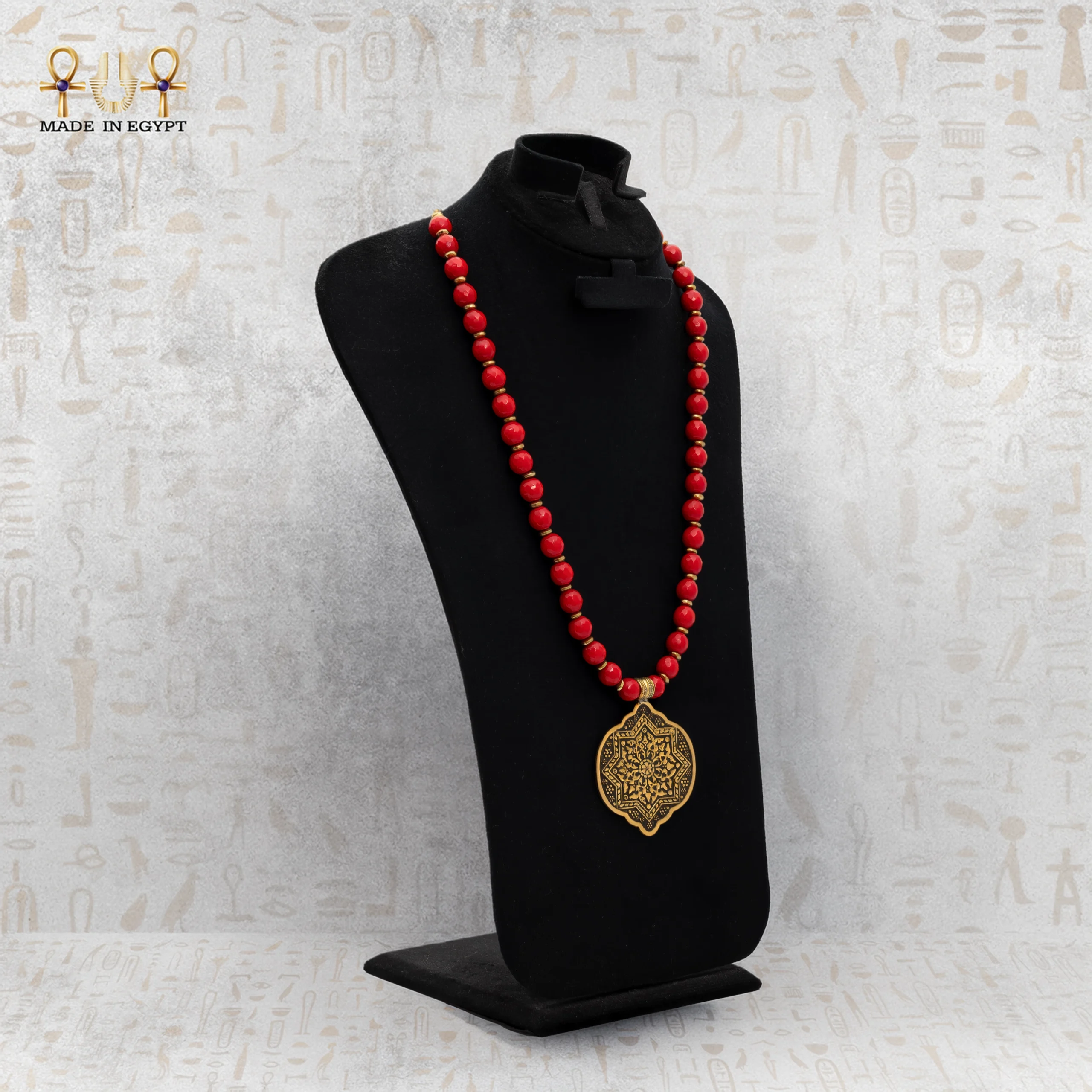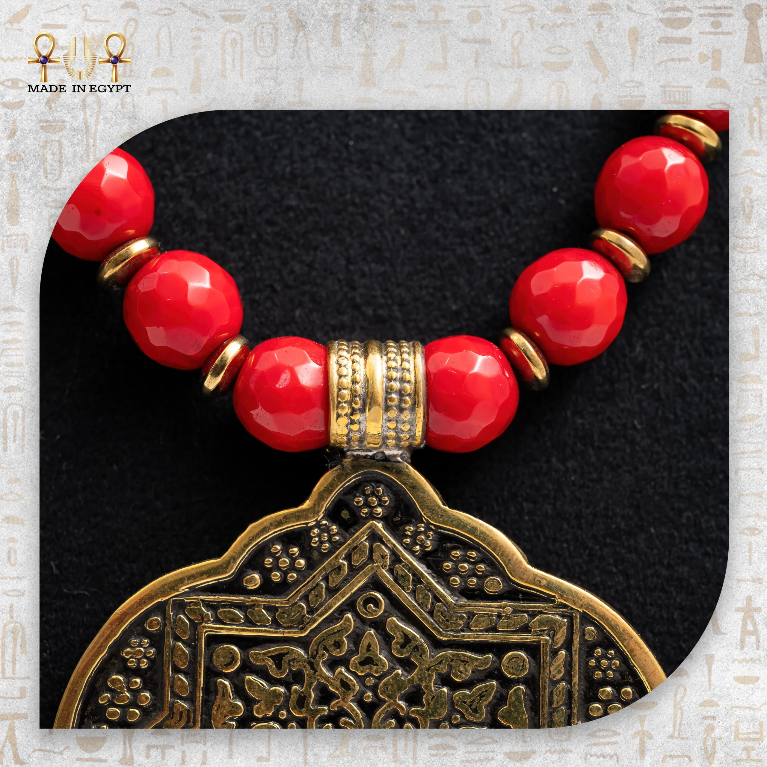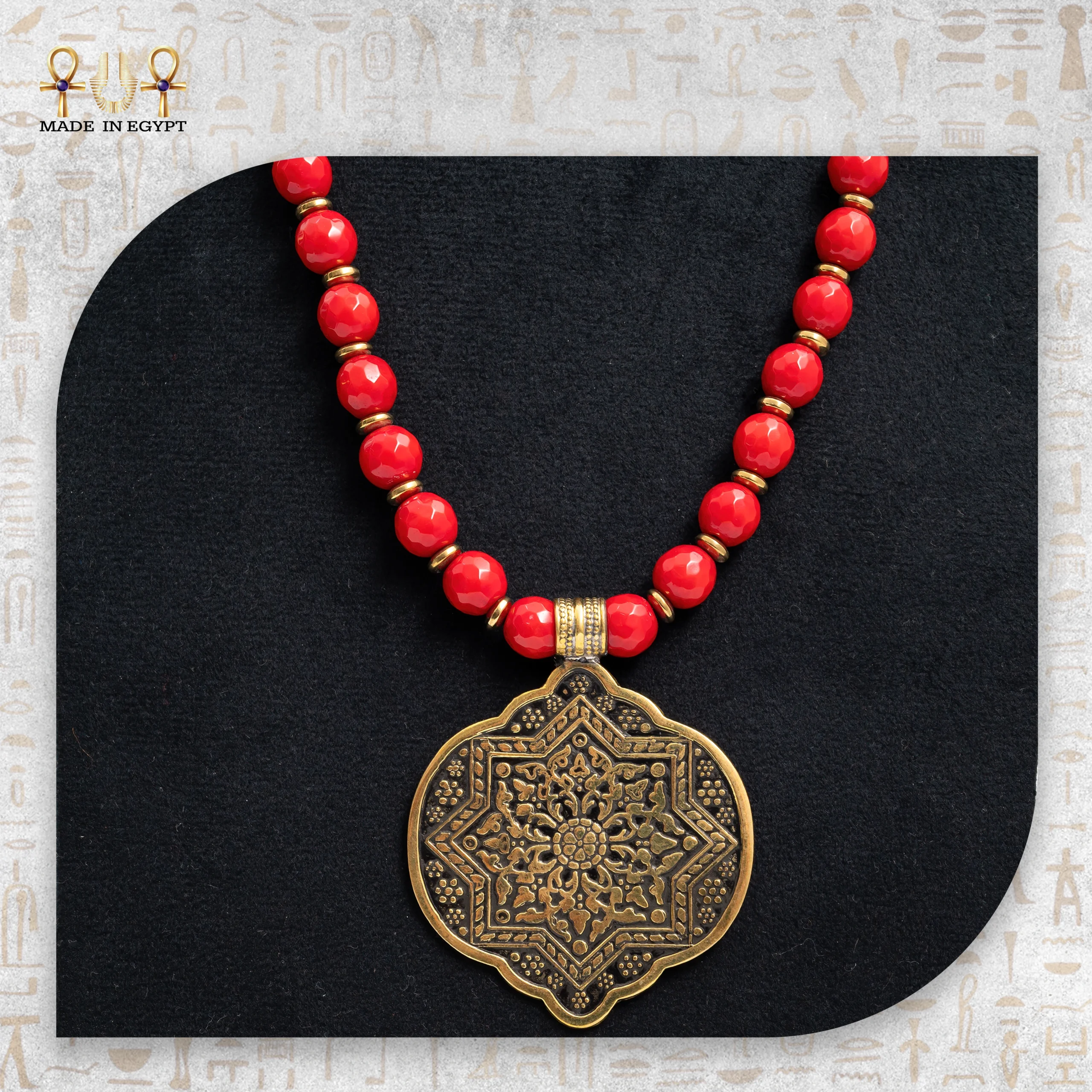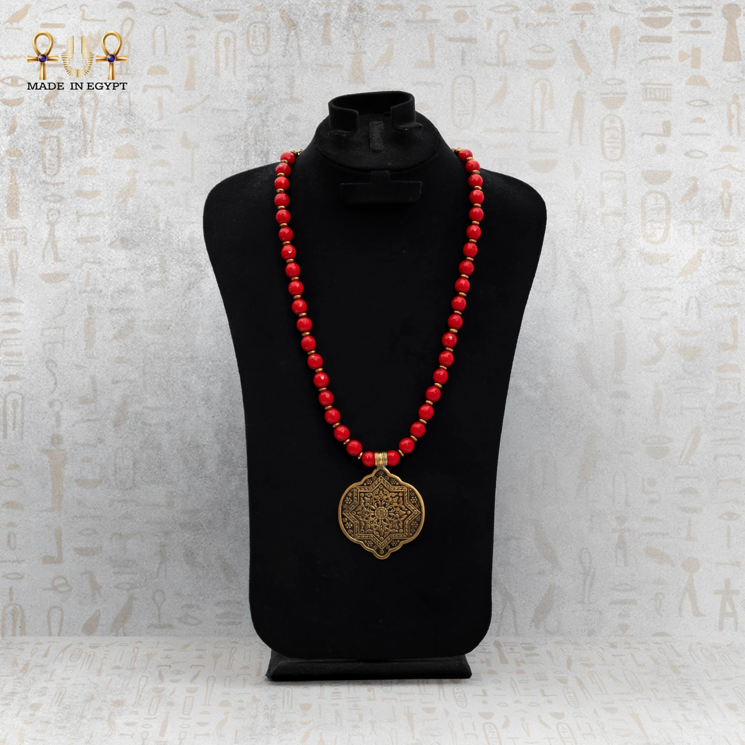 Natural red agate stones bring life to the design. Known for centuries as a stone of protection, courage, and grounding, each polished bead carries unique patterns that symbolize passion, vitality, and strength. When the bold red of the agate meets the antique brass of the pendant, it creates a mesmerizing contrast—raw yet refined, earthy yet elegant. Furthermore, each bead’s natural uniqueness ensures that no two necklaces are exactly alike.