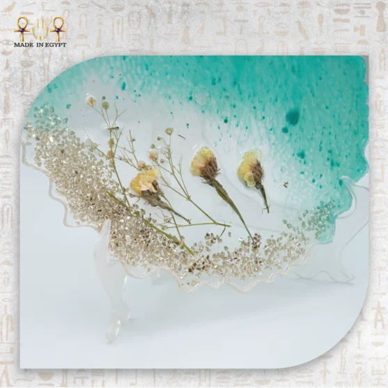 A handmade green resin plate with dried flowers and golden crystals, adding a refined natural touch to any space.