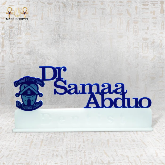 Crafted from multiple precision-cut acrylic layers, this name stand is sturdy, balanced, and durable. The main name — such as Dr Samaa Abduo — is prominently displayed in glossy deep blue for a professional, eye-catching look. The frosted white acrylic base creates smooth contrast and enhances the overall design.
