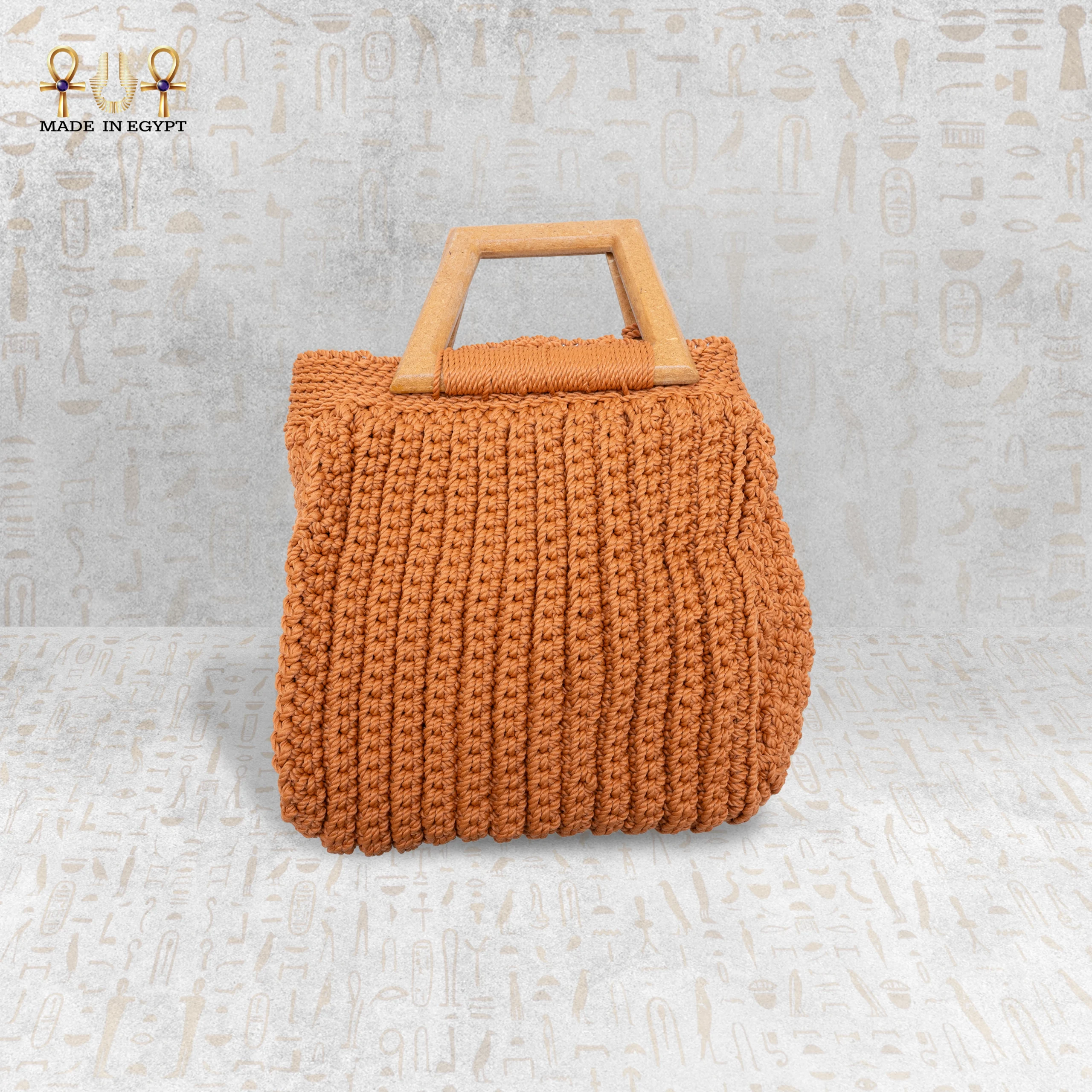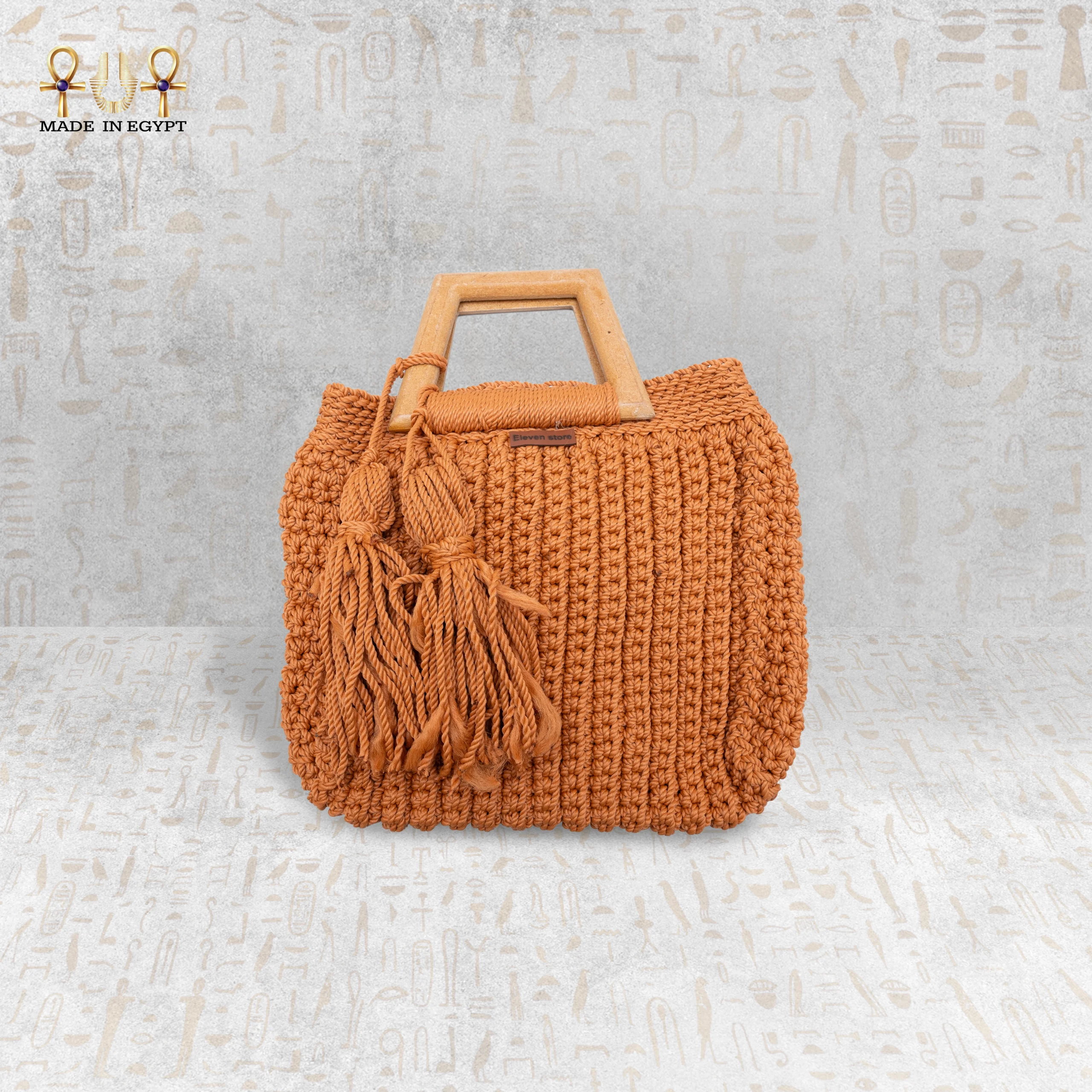 An elegant square crochet bag with a tassel, featuring a practical design and a distinctive feminine touch. Handmade from durable yarn and finished with a wooden handle that adds a refined natural charm. Its size is perfect for your daily essentials and complements both casual and summer outfits with effortless style.
