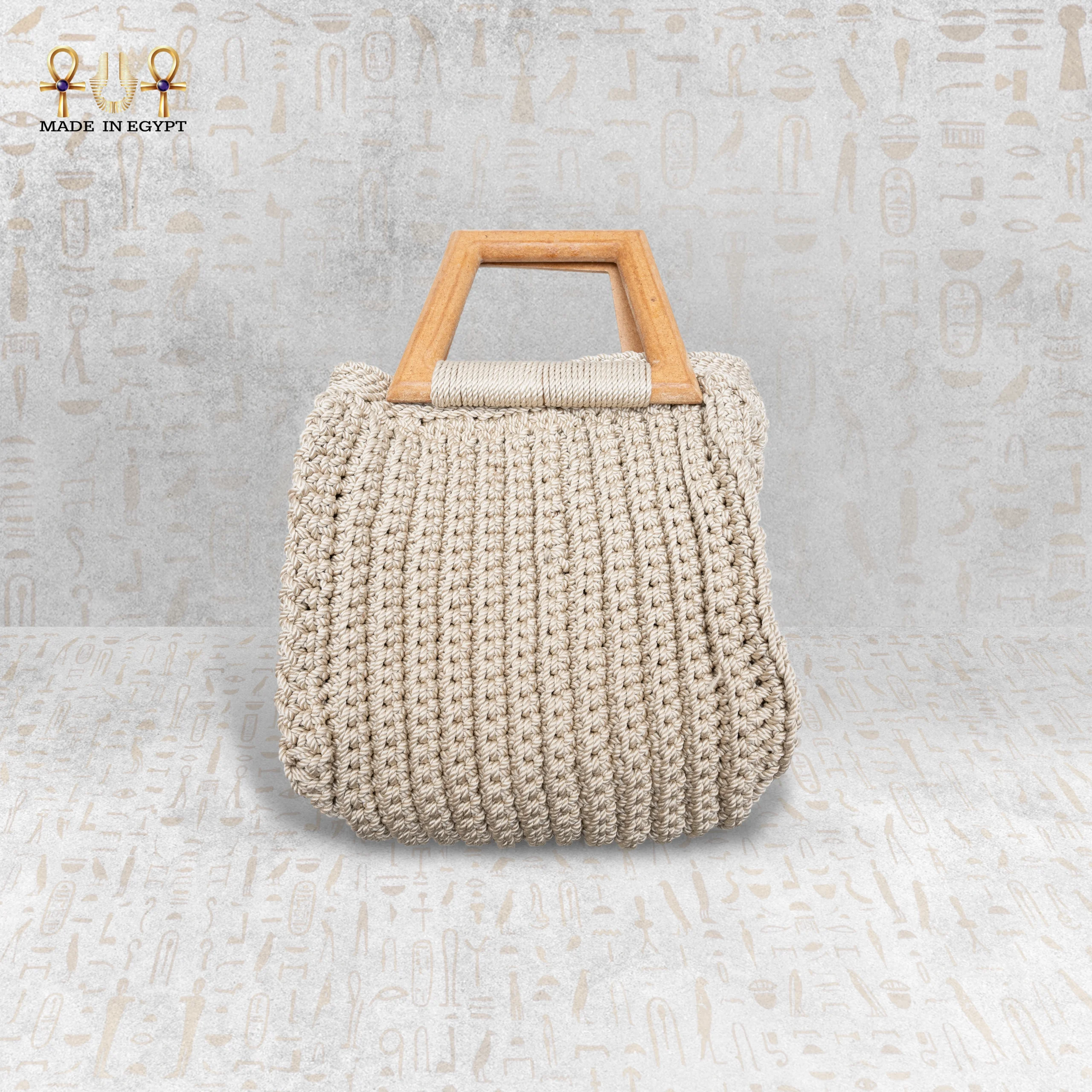 A geometric wooden handle adds a natural and modern feel. It offers a comfortable grip and enhances the overall design. The warm wood tone pairs beautifully with the soft crochet texture.