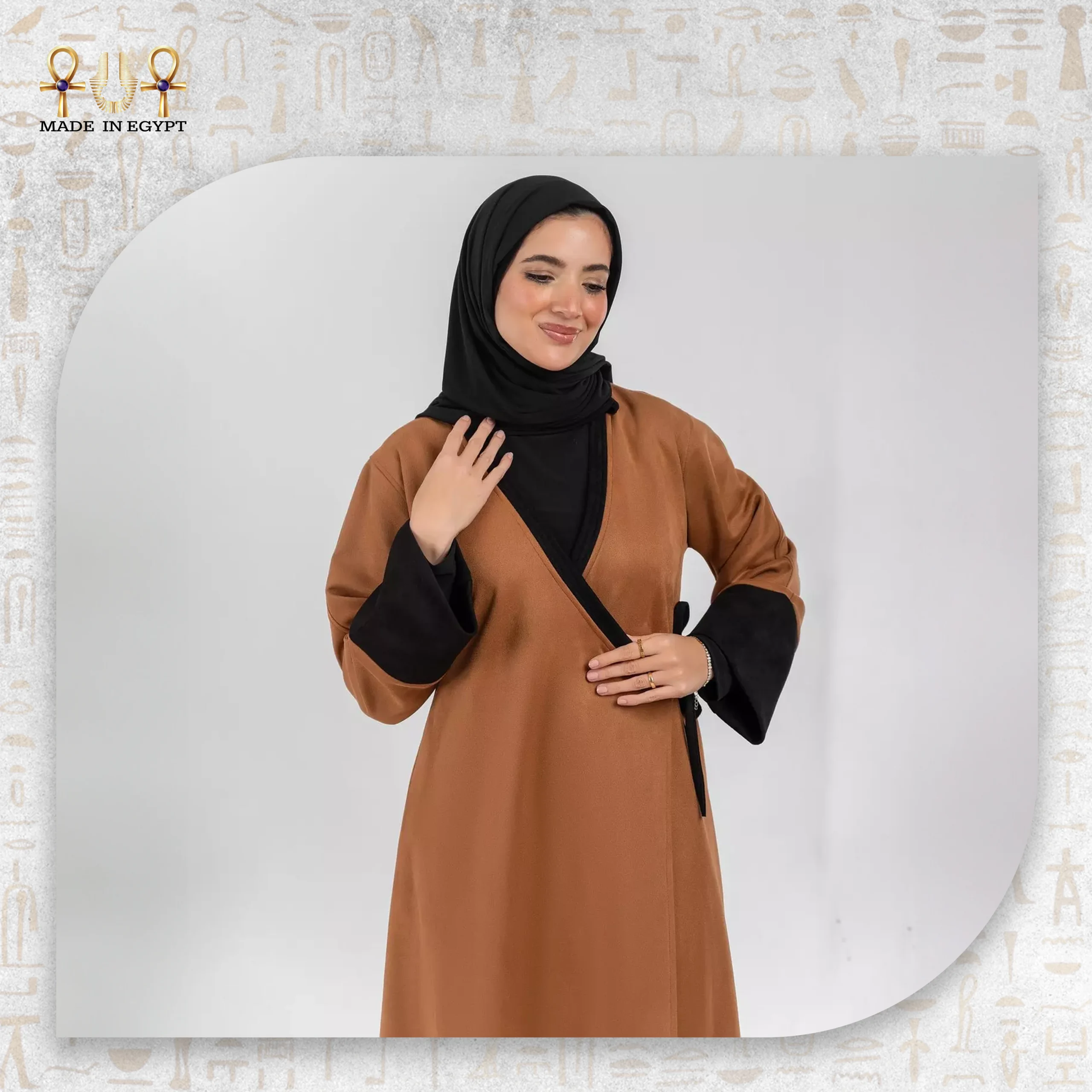 The Suede Wrap Abaya with Integrated Hijab offers a refined look that blends elegance with everyday comfort. It creates a modest and stylish appearance for different occasions. The wrap design flows smoothly around the body and enhances your silhouette in a soft and natural way.