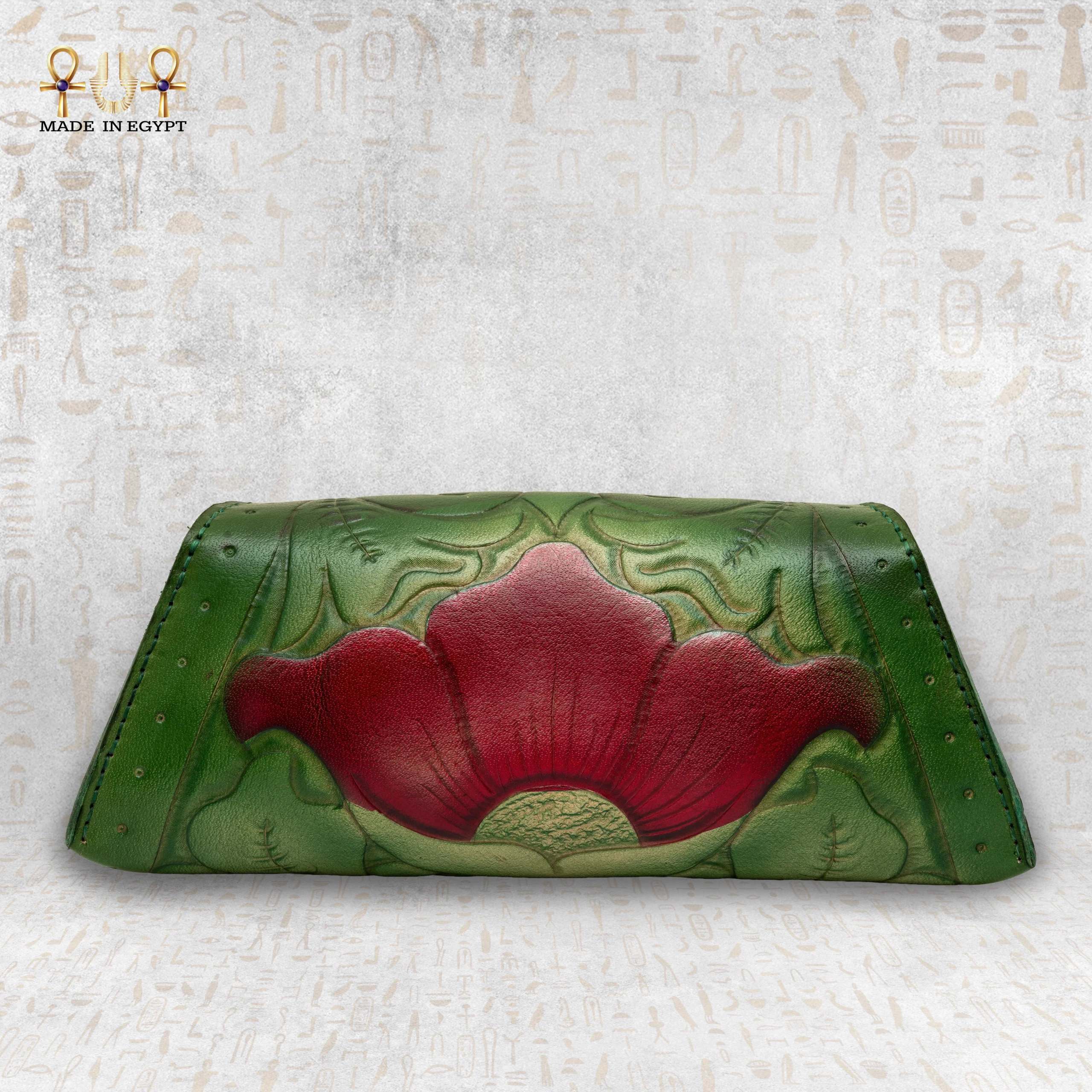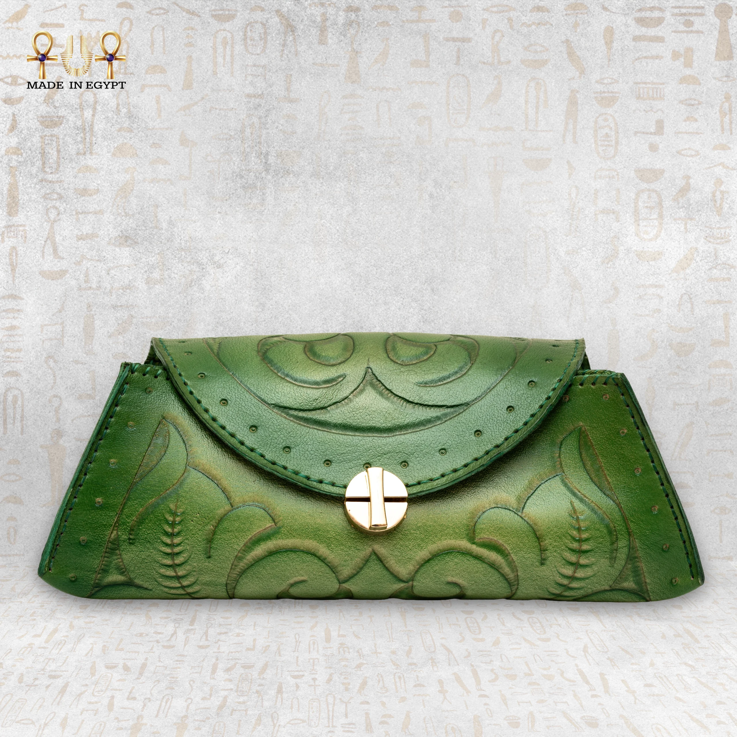 A handcrafted olive-green leather clutch featuring engraved floral patterns, premium cowhide exterior, and soft lambskin lining. Finished with anti-rust metal hardware and an adjustable strap for a luxurious artistic look.