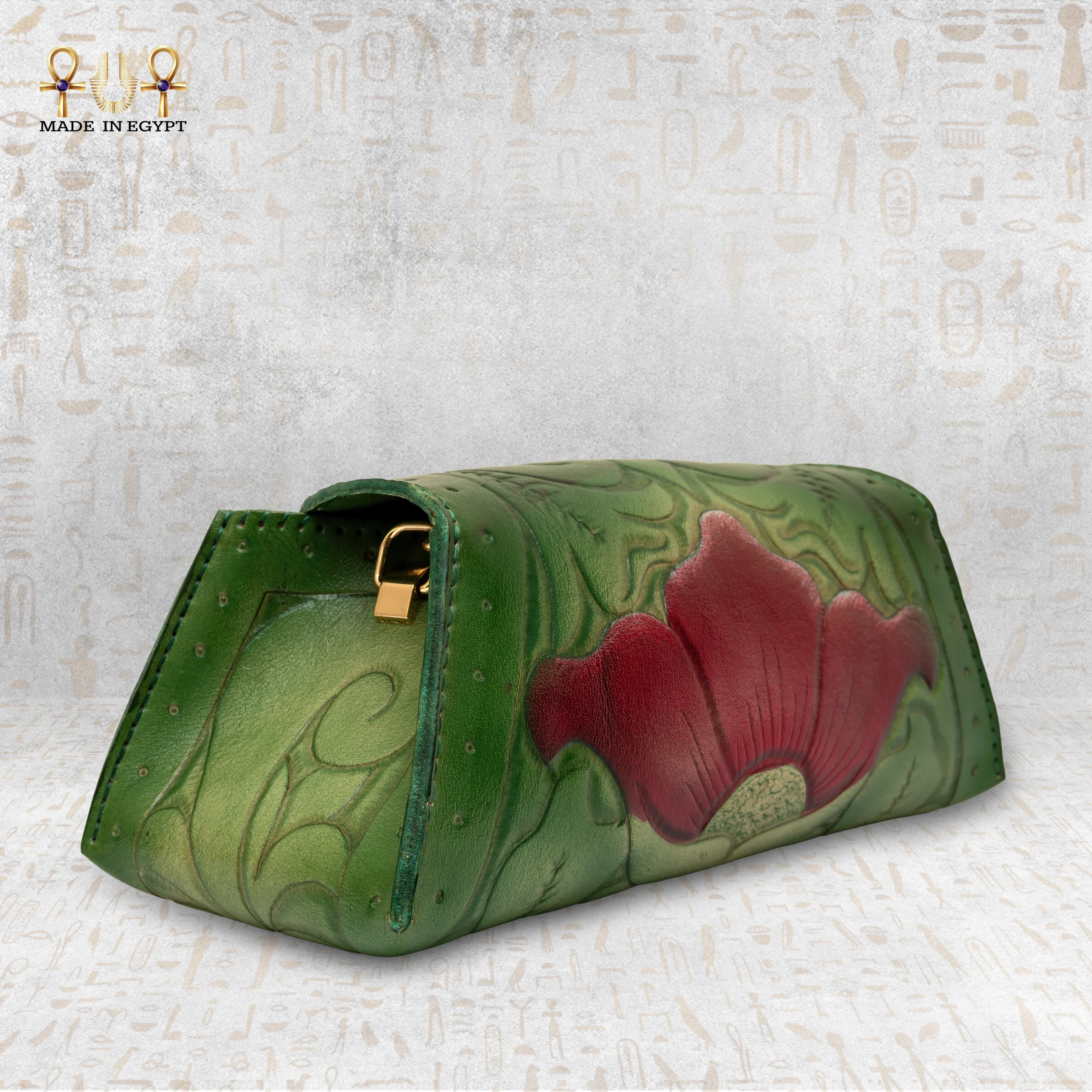 Every inch of the Emerald Oasis Hand comes to life through hand-tooled embossing. Skilled artisans carve flowing botanical patterns directly onto the leather. The raised motifs create a stunning 3D effect, making the bag feel like wearable art. On one side, a large hand-painted flower blooms in deep red with soft gradients, symbolizing femininity and strength. Surrounding leaves and swirling vines are carefully shaded in multiple green tones, enhancing the natural look.
