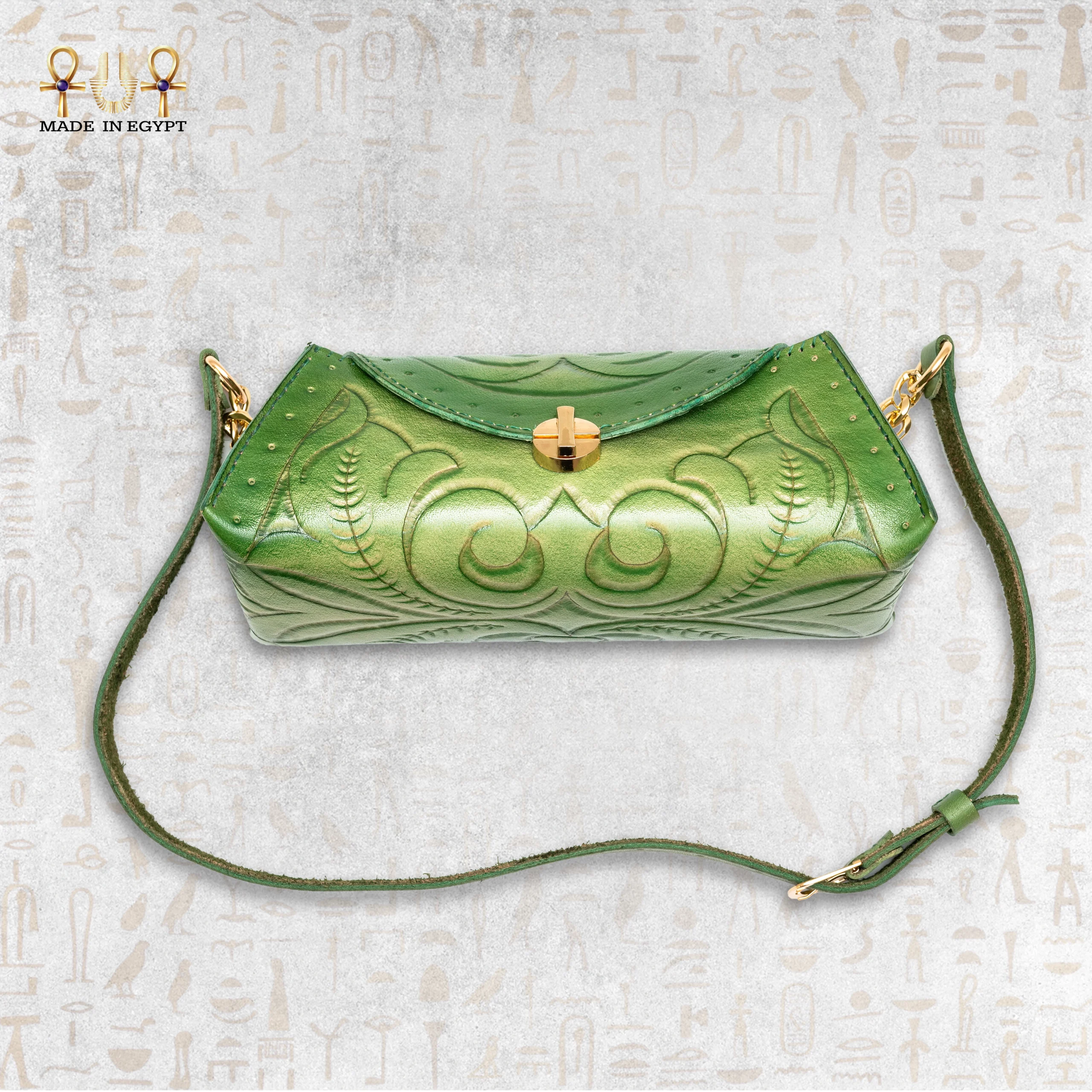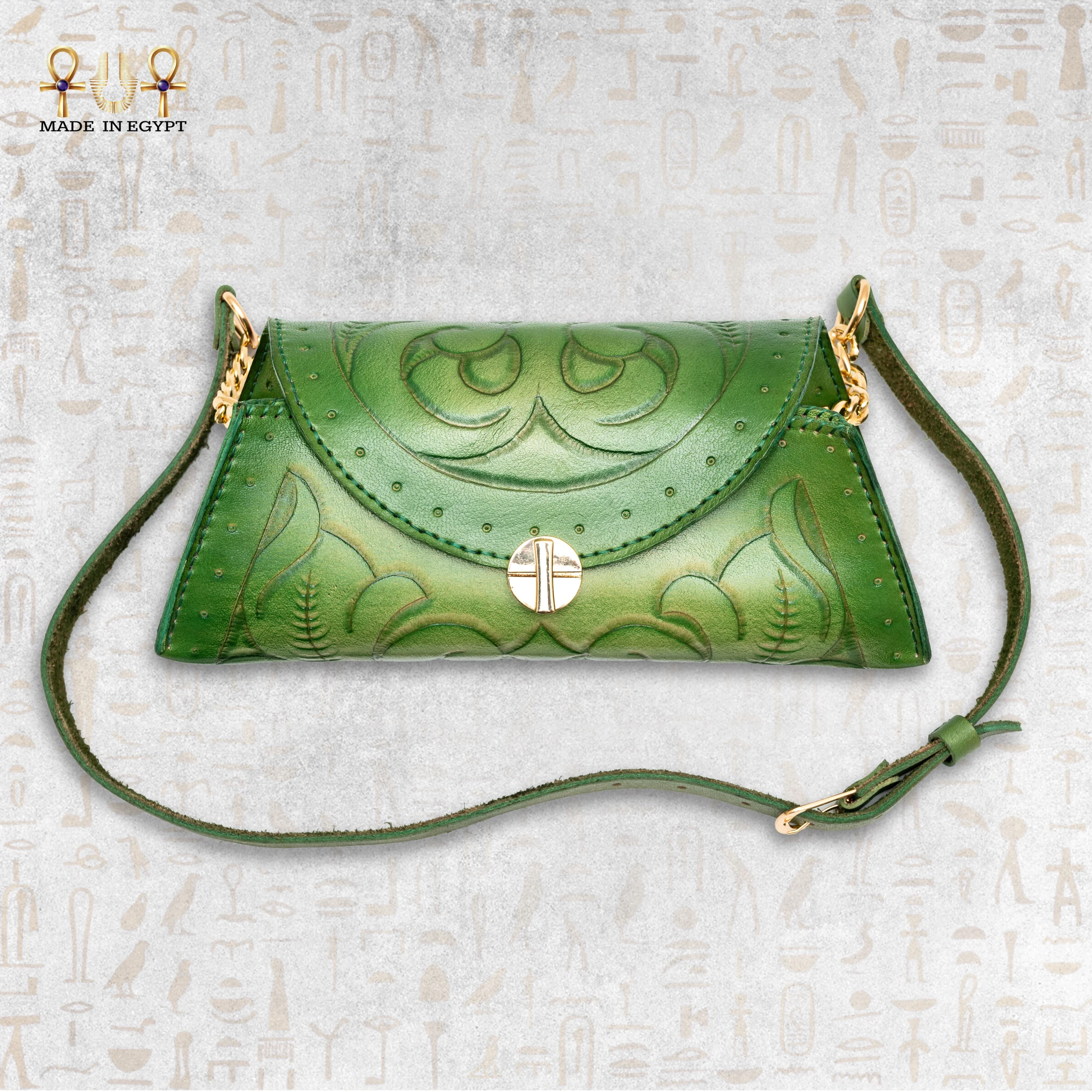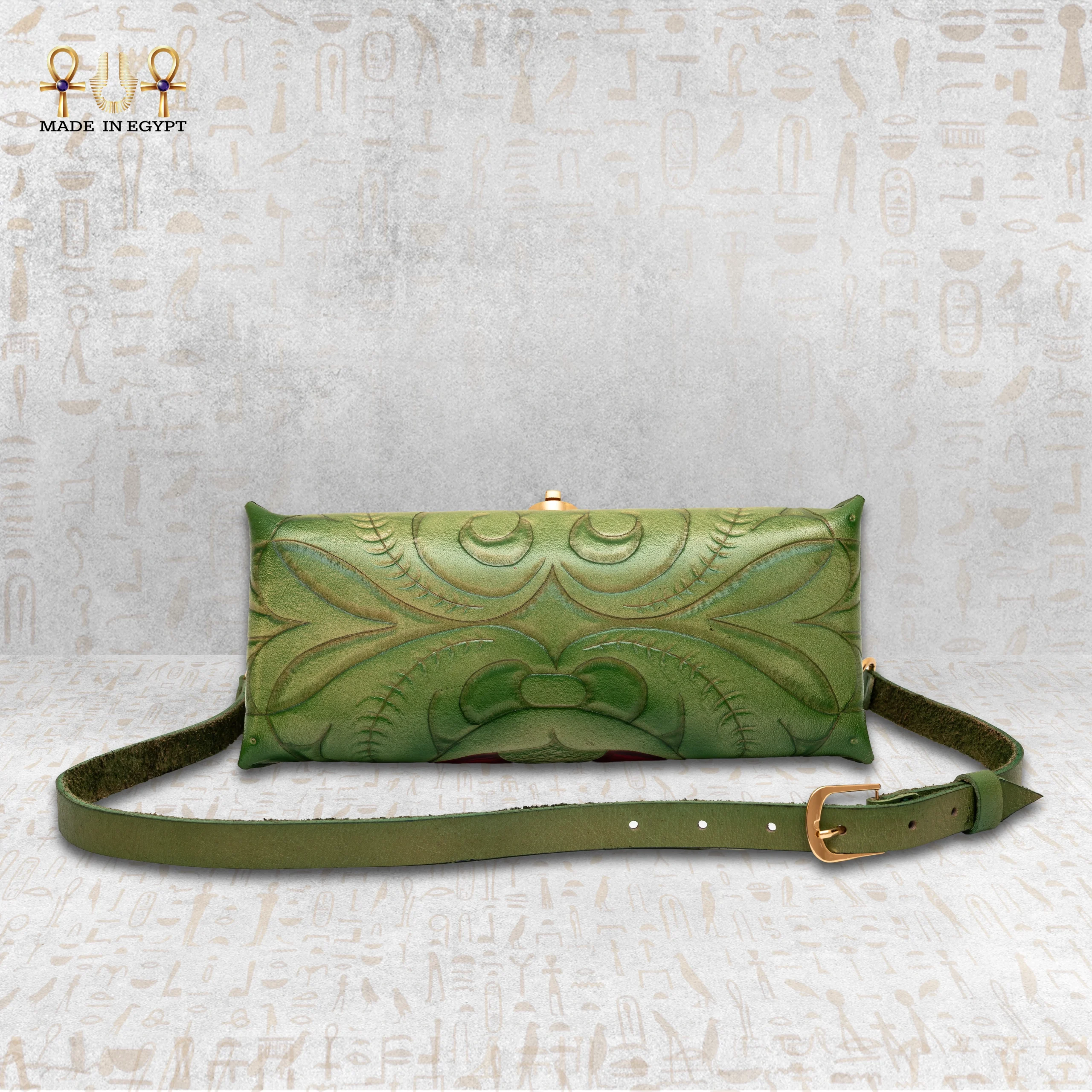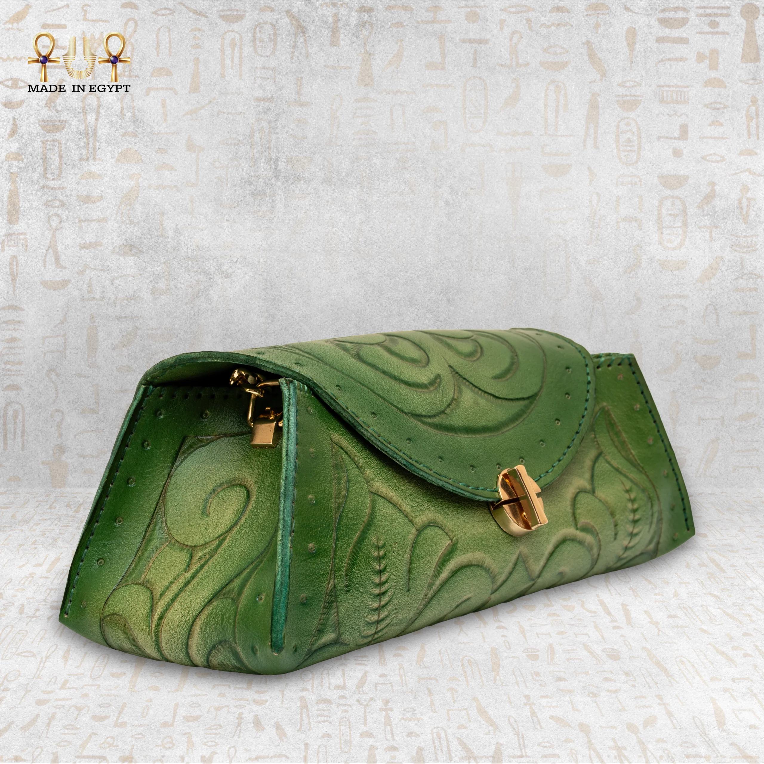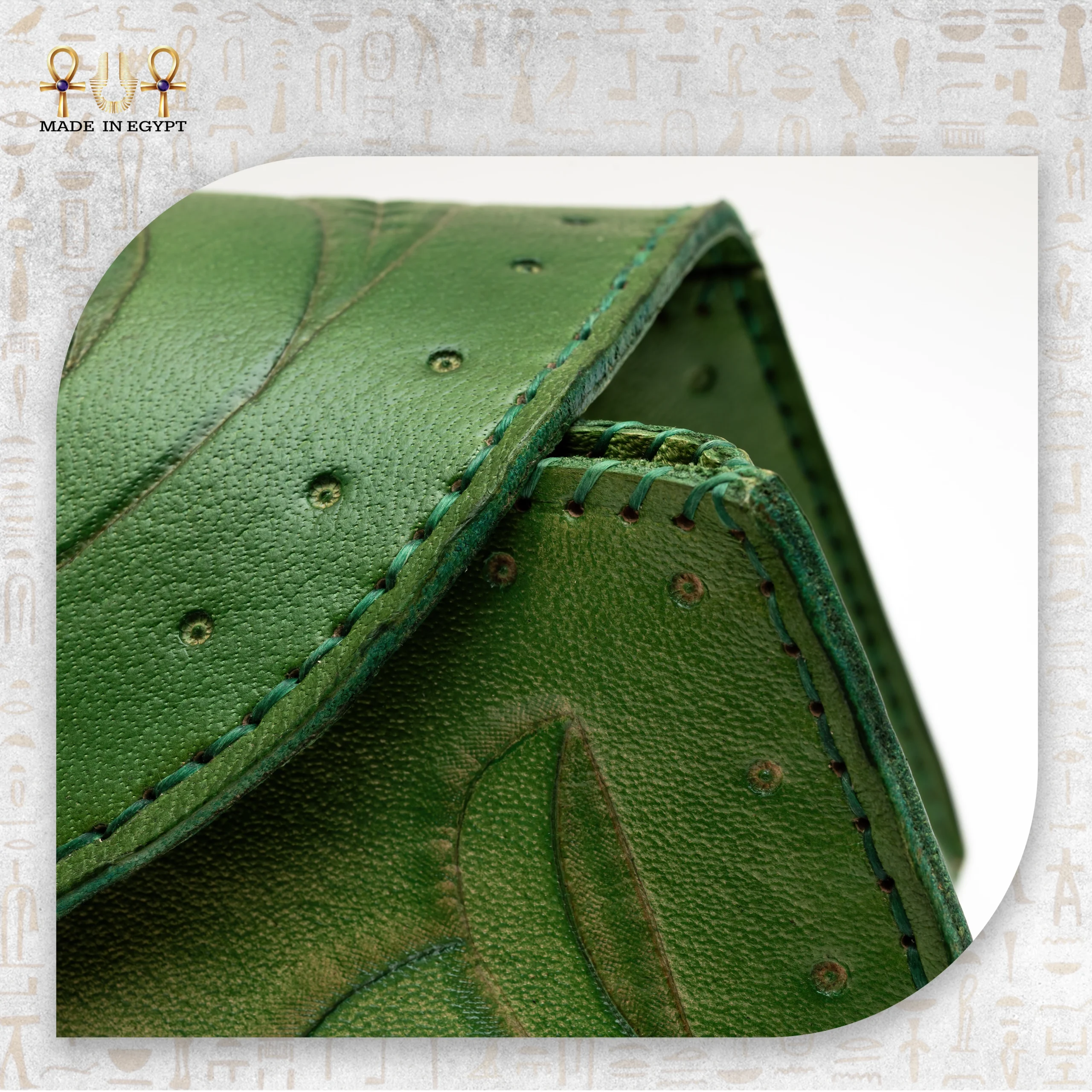 The Emerald Oasis Hand is a handcrafted green leather bag that makes a bold statement of artistry, tradition, and elegance. Artisans design it for women who value pieces that tell a story. Made from premium full-grain cow leather and lined with soft sheepskin, the bag offers durability, luxury, and a rich natural texture.