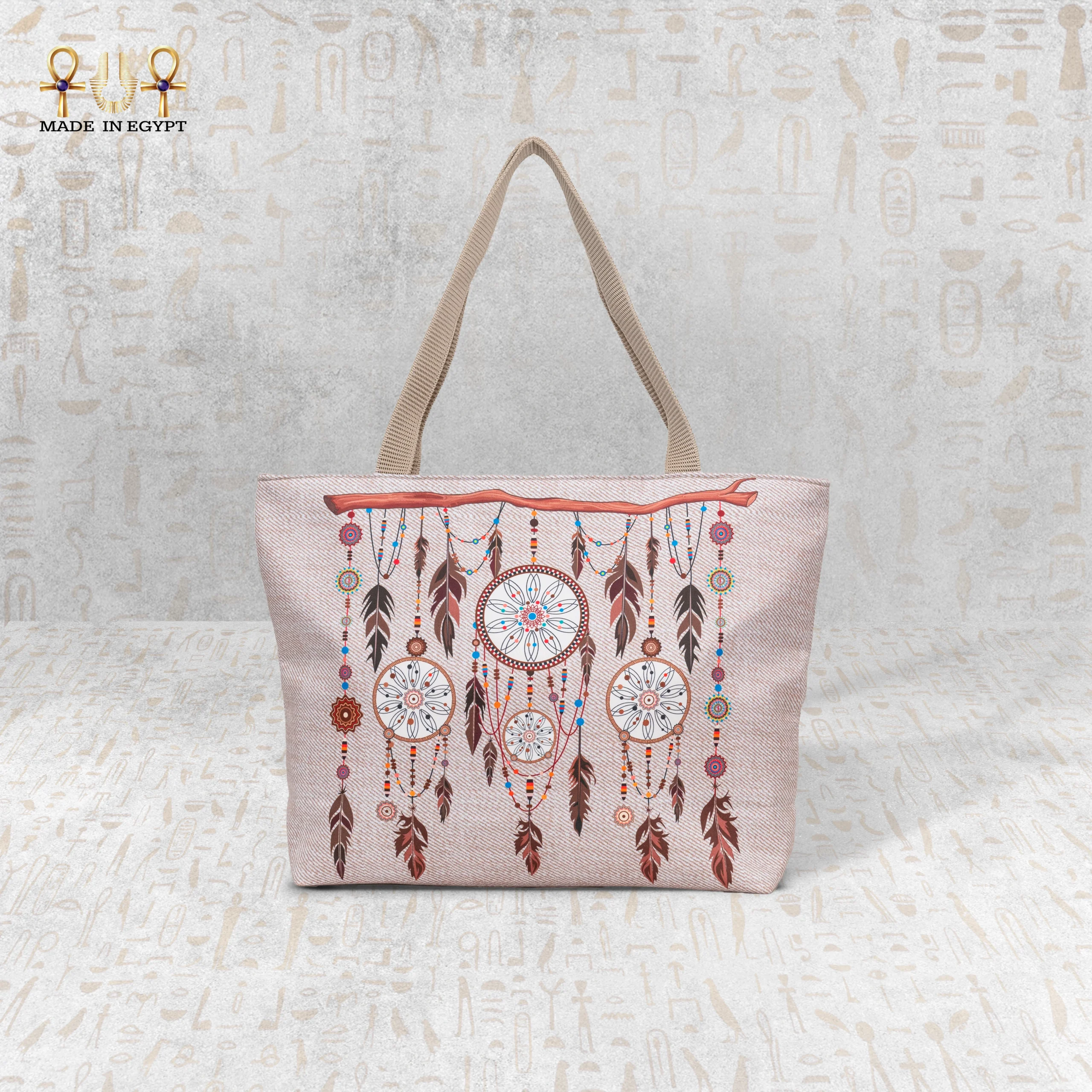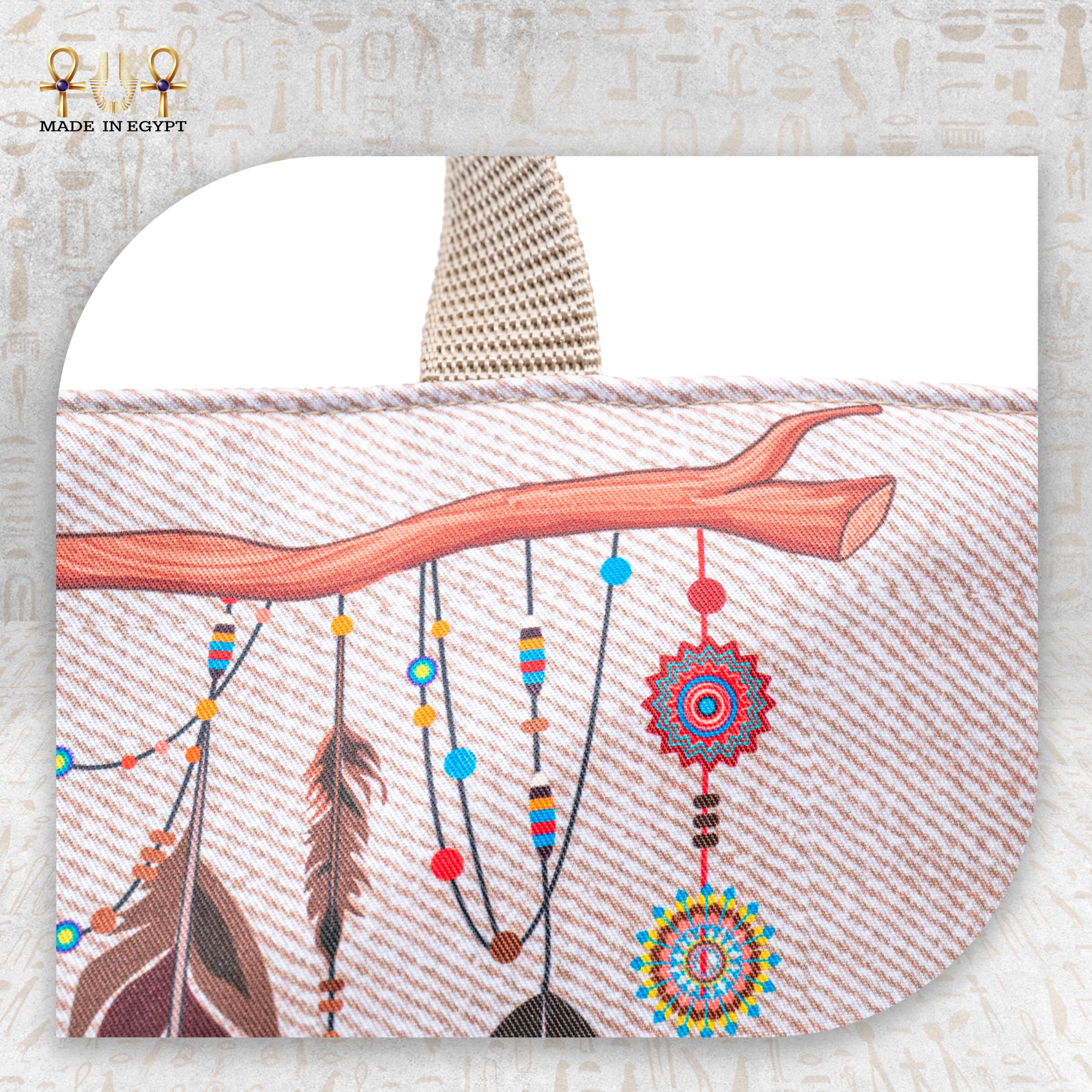 The ethnic printed casual tote bag with Dreamcatcher design is a stylish addition to your everyday look. It blends modern fashion with a touch of cultural art. The bag features vibrant patterns in shades of brown, red, blue, and yellow. Feathers and dreamcatcher circles decorate the surface, symbolizing freedom, positivity, and a bohemian spirit.