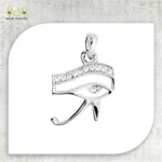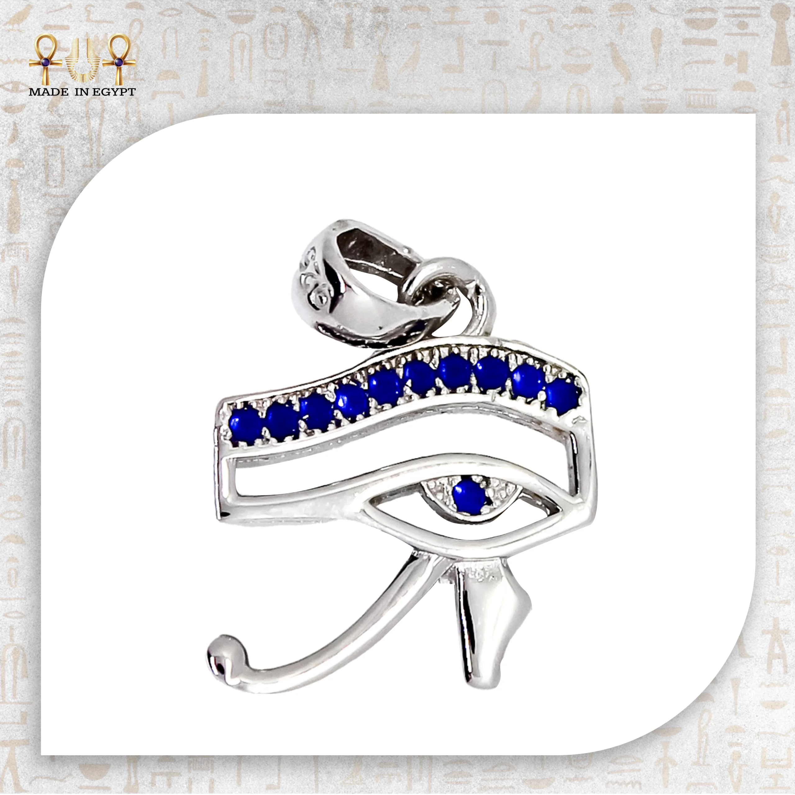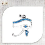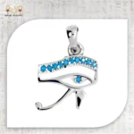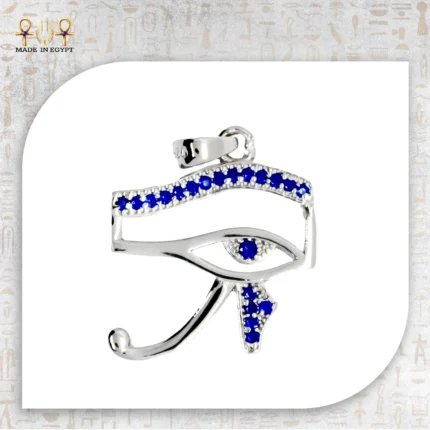 The design features the iconic eye shape with sweeping lines and smooth curves. Each detail symbolizes focus, resilience, and insight. Crafted from polished silver-plated metal, the pendant glows with a clean, mirror-like shine. Deep turquoise-blue stones accent the eye, giving it a refined touch of color inspired by the Nile’s pure waters and the vast Egyptian sky. These stones carry their own symbolism: calm, purity, and spiritual depth.