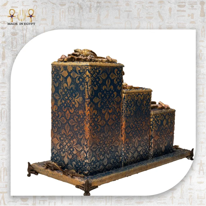 The set features three handcrafted containers of different sizes resting on a golden-touched base. Each piece glows with detailed patterns in deep blue intertwined with gold and copper tones. The aged finish creates a luxurious vintage charm. The lids display sculpted flowers and birds—symbols of growth, warmth, and freedom. As a result, the Floral Symphony Set conveys life and serenity while radiating royal refinement. Every surface demonstrates patience, creativity, and the legacy of Egyptian artisans.