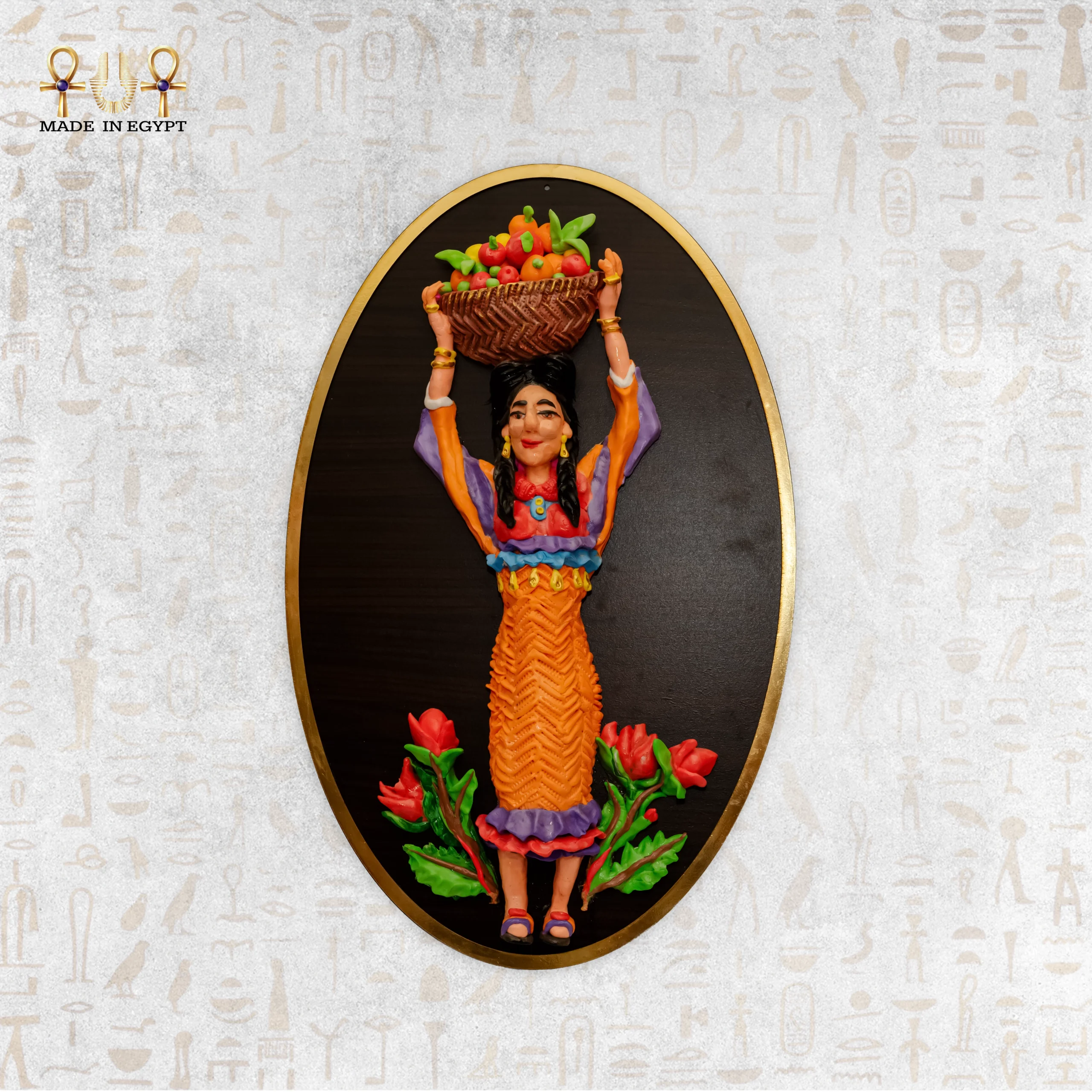 The Fruits of the Land Wall Art is a handcrafted folk décor piece inspired by traditional Egyptian rural life. It portrays a countryside woman standing proudly while carrying a basket filled with fresh fruits on her head—a powerful symbol of harvest, abundance, and the deep connection between people and the land.